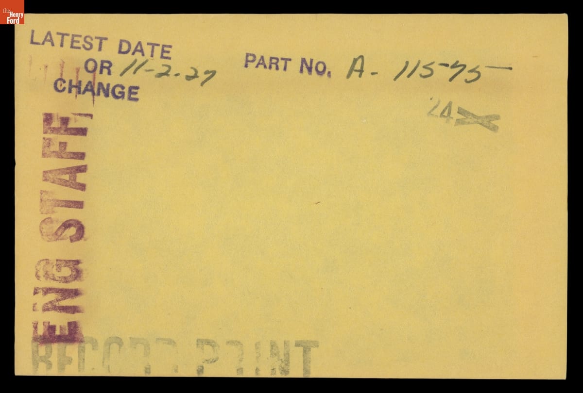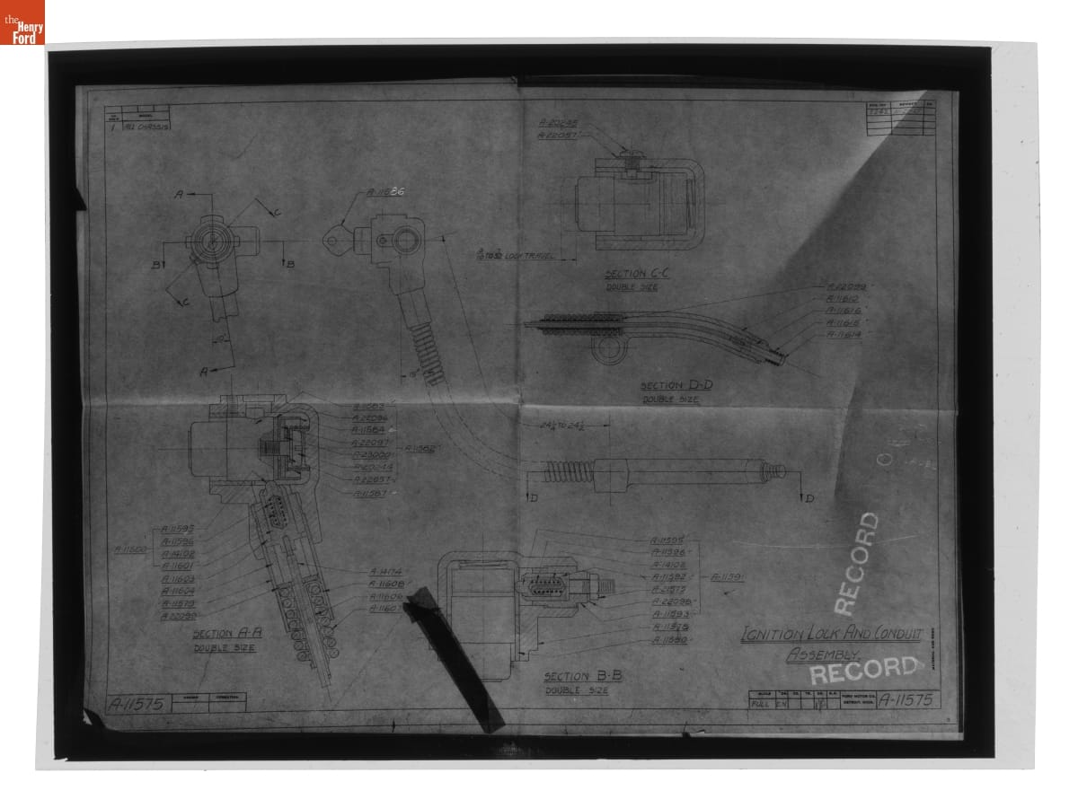 The Ford Motor Company created over a million parts drawings from 1903 to 1957. Many of these drawings specify engineering requirements for the components of Ford-made vehicles--including automobiles, trucks, tractors, military vehicles and Tri-motor airplanes. Others document assembly components, stages of casting and forging, or experimental designs. Beginning in the 1940s, Ford transferred the drawings to microfilm.