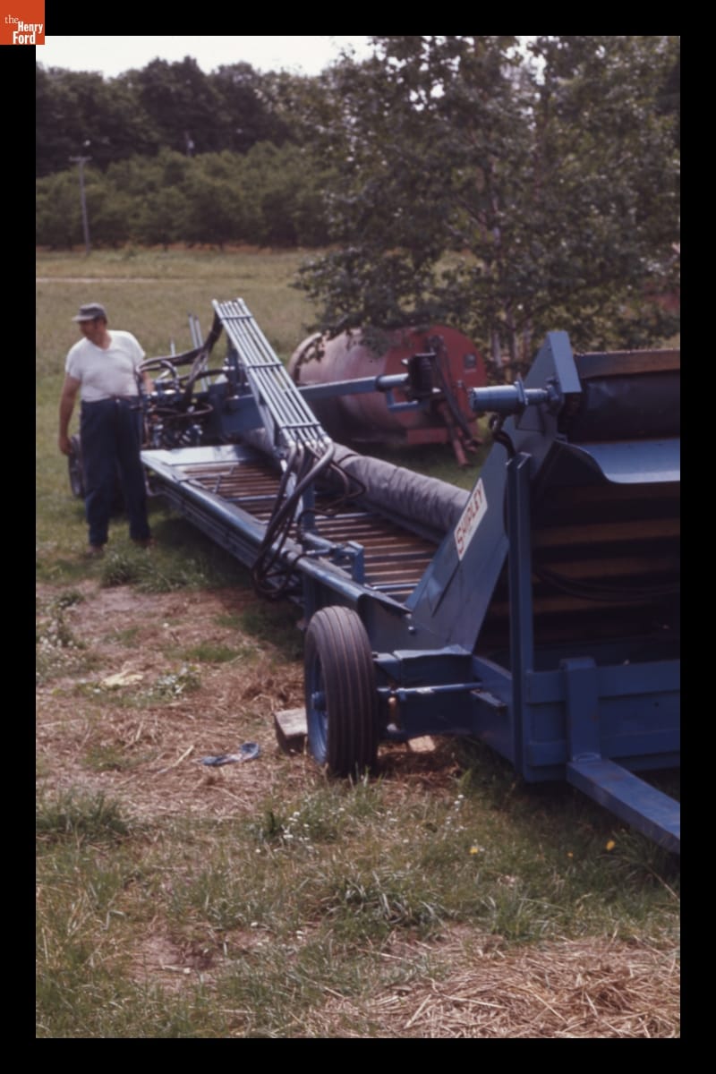 Cherry growers hired pickers (often migrant laborers) to harvest their crops, but growers sought faster, less labor-intensive solutions. Agricultural engineers developed mechanical harvesters by the late 1960s. These machines shook the trees, causing the ripe fruit to drop onto collecting mats. This slide shows a stage in a mechanical harvest on a family farm in Michigan's cherry-growing region near Traverse City.