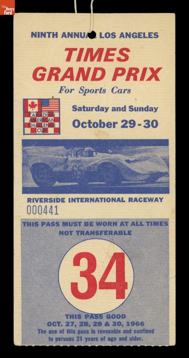 Dave Friedman captured and preserved auto racing history through his photography and memorabilia. His collection documents key races, cars, drivers, and teams. This item is from the ninth annual Los Angeles Times Grand Prix, held at California's Riverside International Raceway in October 1966. British racer John Surtees won the 200-mile main race in a Chevrolet-powered Lola T70 Mark II.