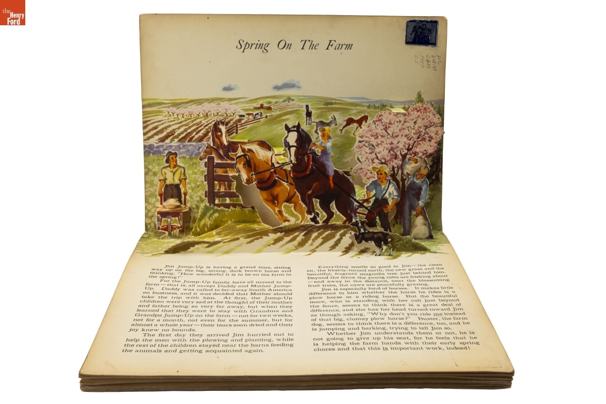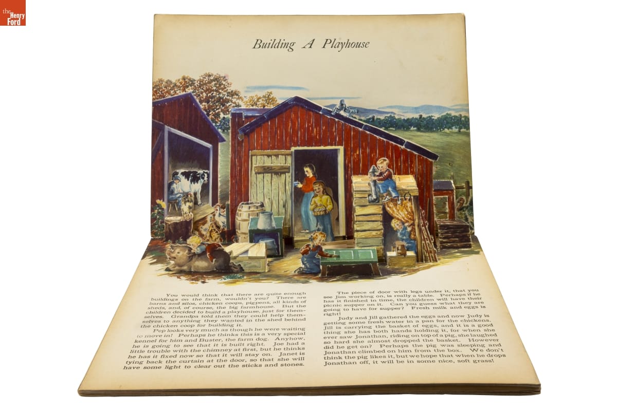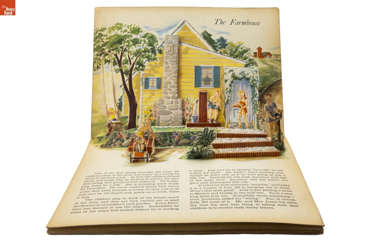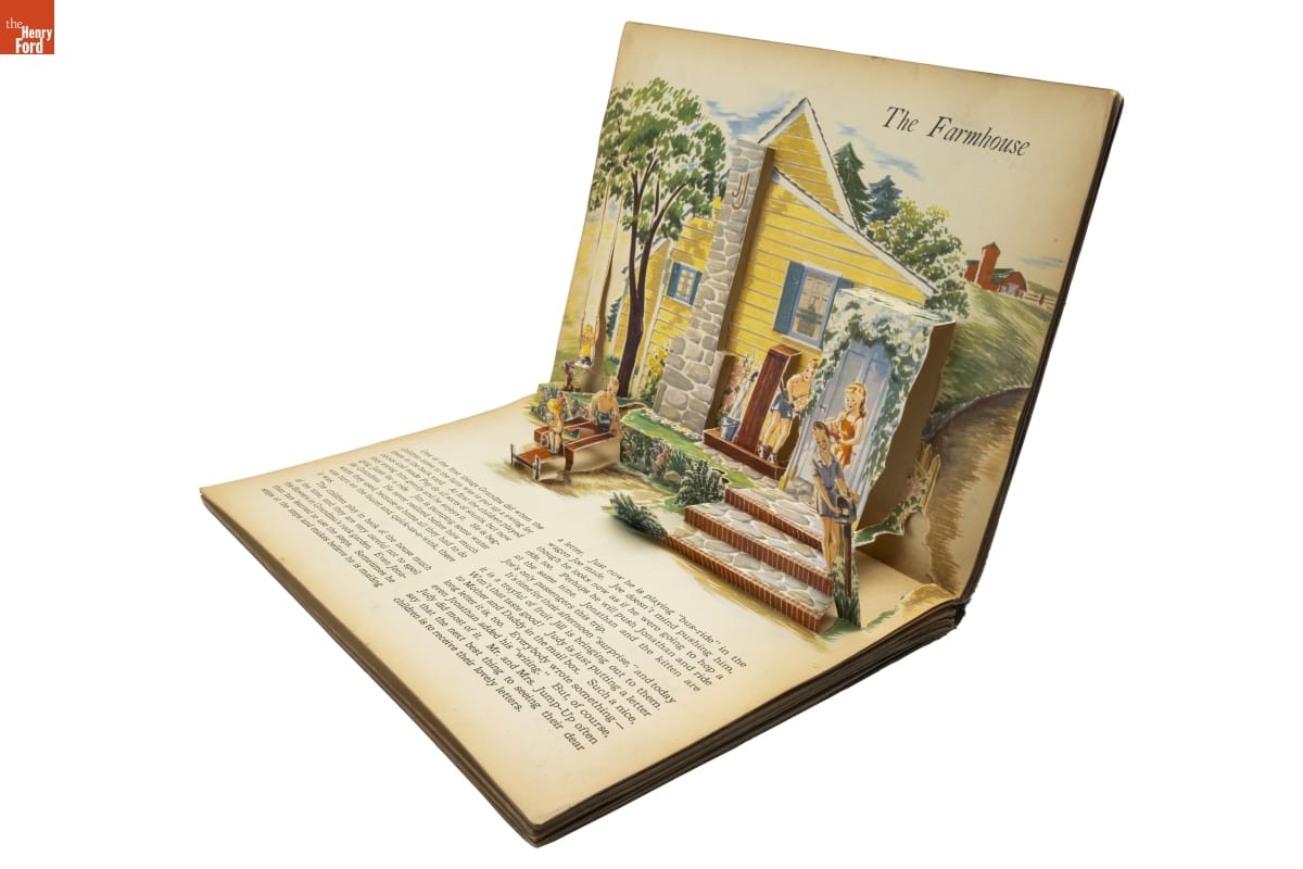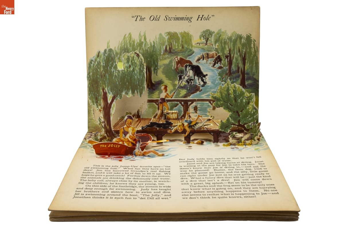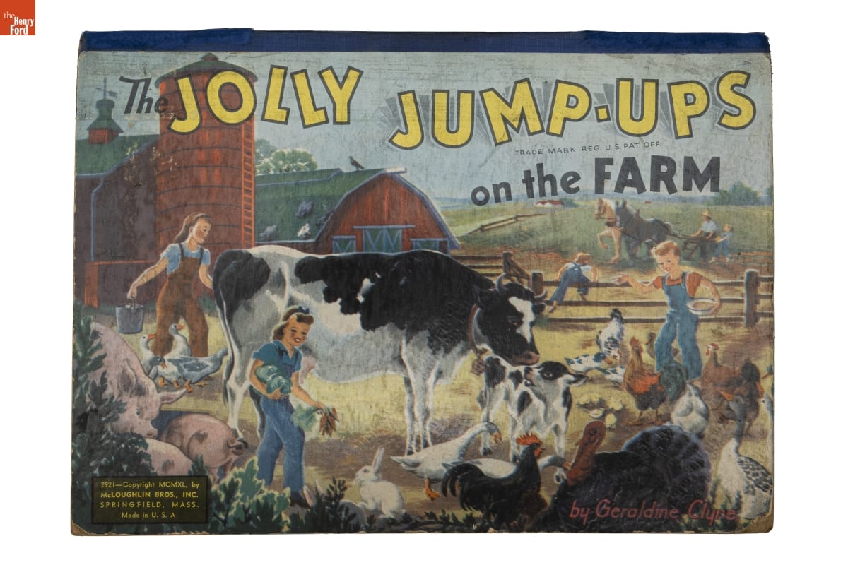 Geraldine Clyne and her husband created the Jolly Jump-up series of pop-up books from the late 1930s into the 1950s. Their illustrations -- printed, die-cut, and folded from a single paper sheet -- created a 3-dimensional image when readers opened the book. Clyne's stories followed the adventures of the Jump-Up family, like this one about the children's idyllic summer on the farm.