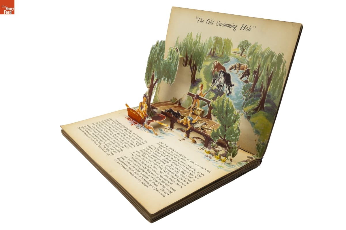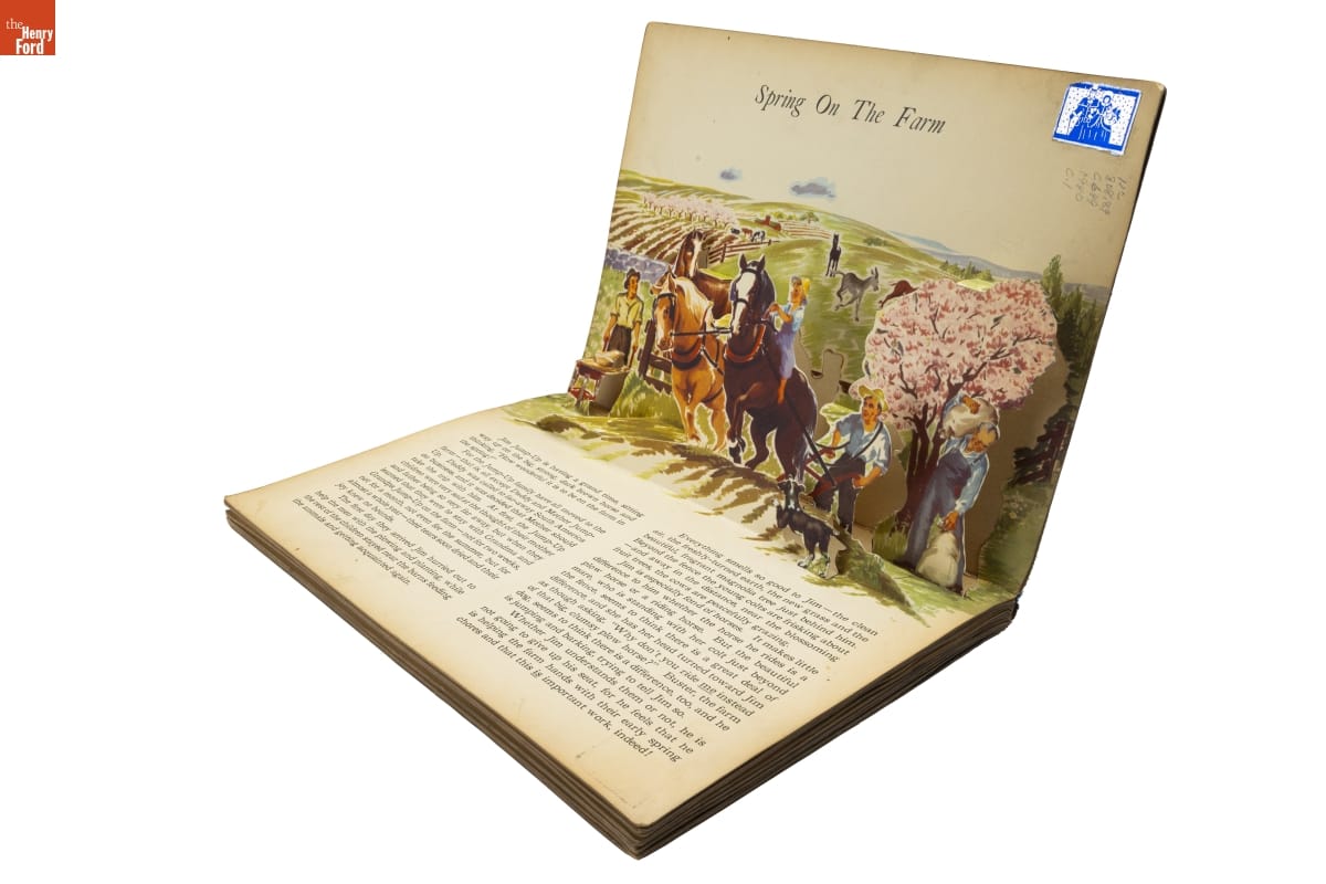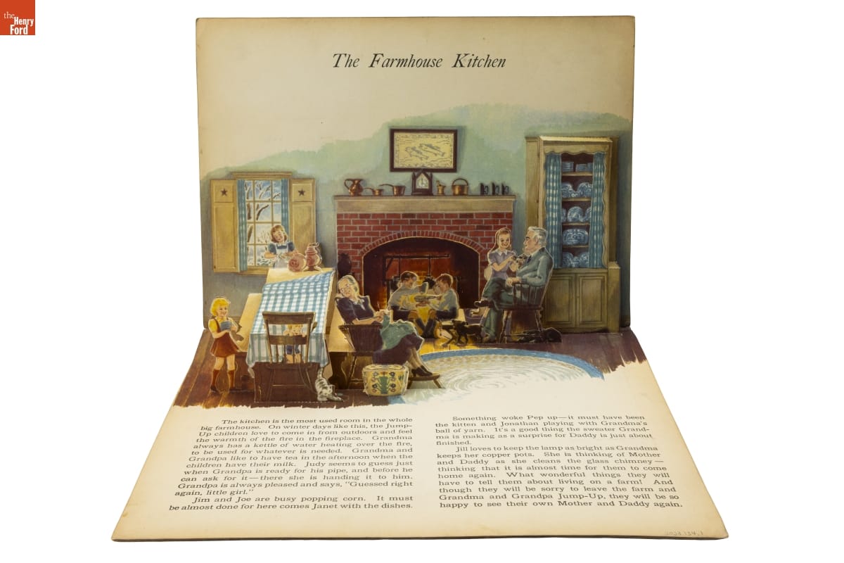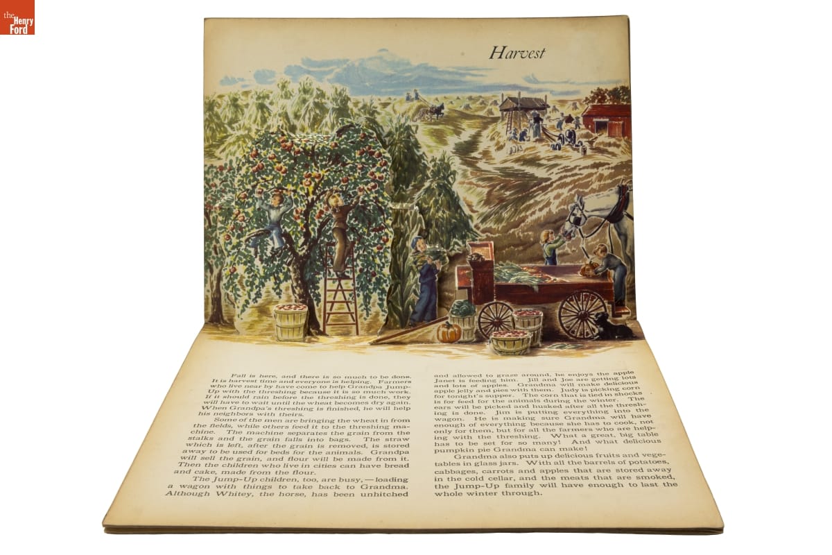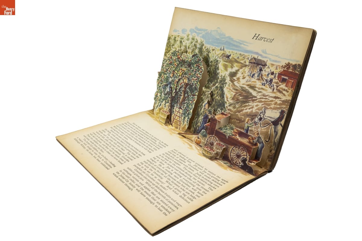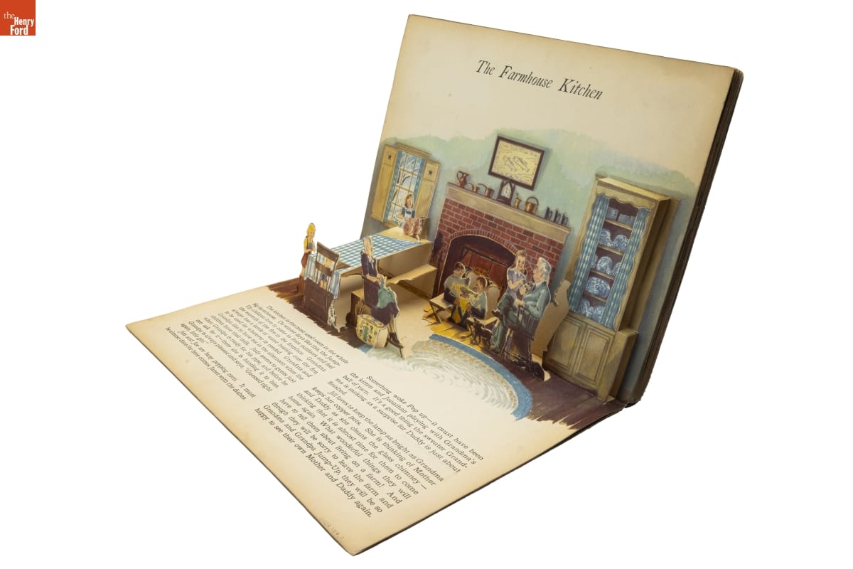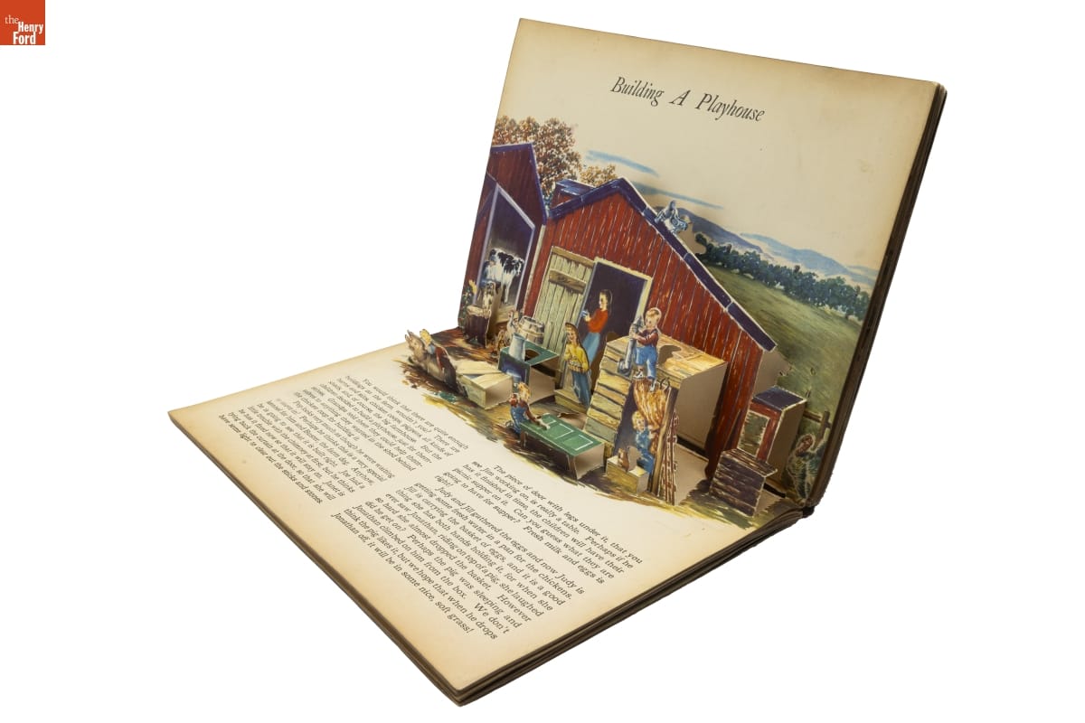 Geraldine Clyne and her husband created the Jolly Jump-up series of pop-up books from the late 1930s into the 1950s. Their illustrations -- printed, die-cut, and folded from a single paper sheet -- created a 3-dimensional image when readers opened the book. Clyne's stories followed the adventures of the Jump-Up family, like this one about the children's idyllic summer on the farm.