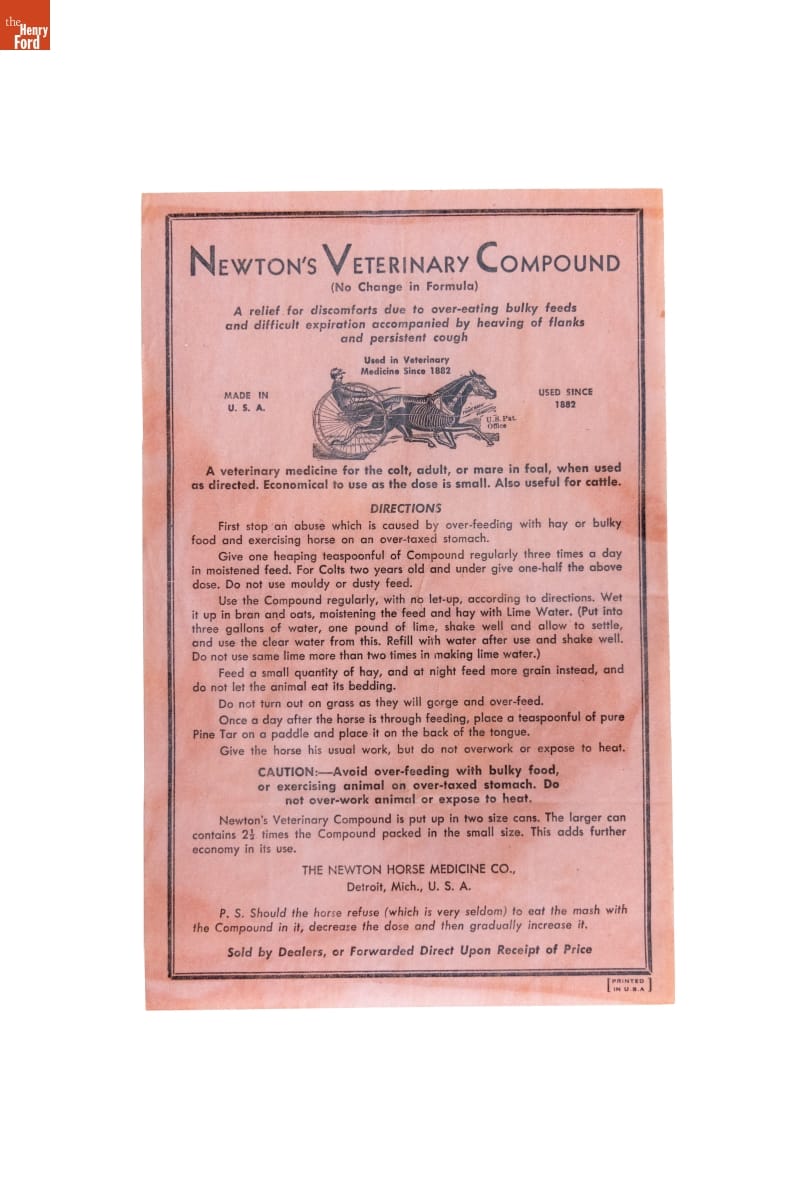 Has been a preparation [missing] general use and in Veterinary practice since 1882 / Manufactured and Packed by / THE NEWTON HORSE MEDICINE CO. / Detroit 4, Mich., U.S.A. / Sold by Dealers, or Forwarded Directly on Receipt of Price / label Adopted 1930 - Revised to conform to new Food, Drug and Cosmetic Act of 1939