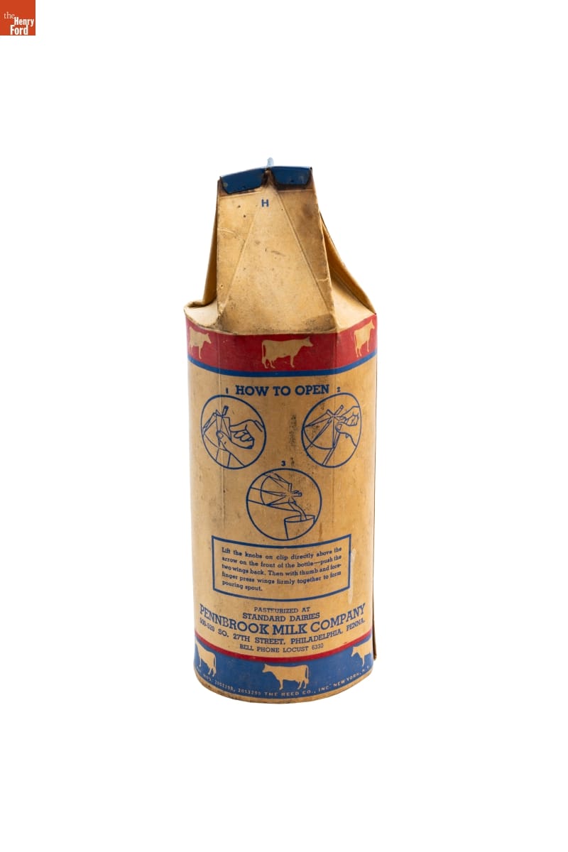 HOW TO OPEN / Lift the knobs on clip directly above the / arrow on the front of the bottle - push the / two wings back. Then with thumb and fore - / finger press wings firmly together to form / pouring spout. / PASTEURIZED AT / STANDARD DAIRIES / PENNBROOK MILK COMPANY / 500-520 SO. 27TH STREET, PHILADELPHIA, PENNA / BELL PHONE LOCUST 6330