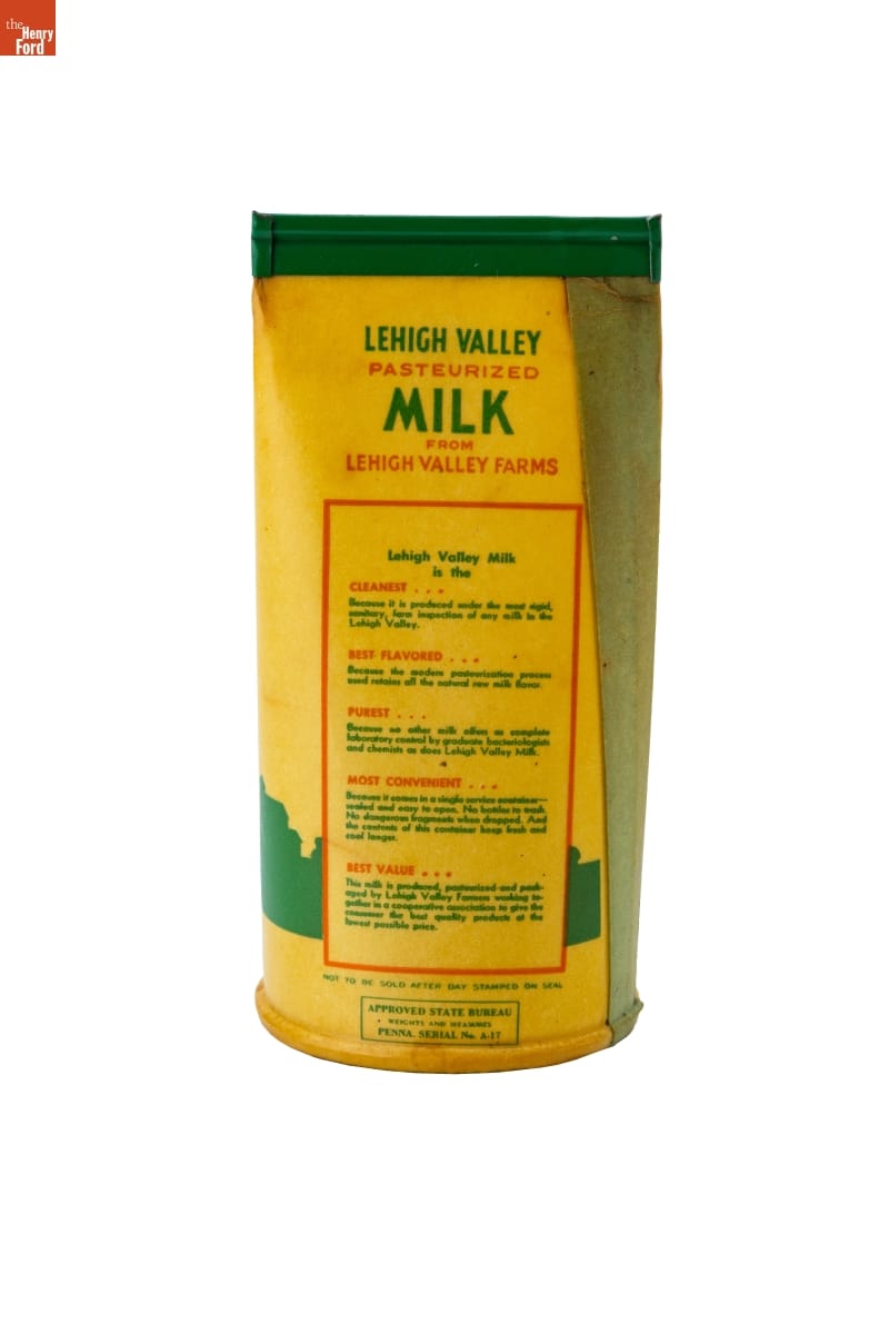 LEHIGH VALLEY / PASTEURIZED / MILK / FROM / LEHIGH VALLEY FARMS / [...] / NOT TO BE SOLD AFTER DAY STAMPED ON SEAL / APPROVED STATE BUREAU / WEIGHTS AND MEASURES / PENNA. SERIAL No. A-17