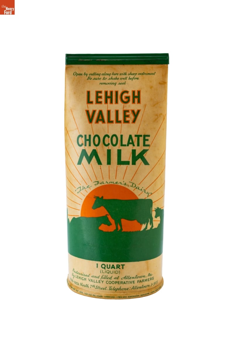 Open by cutting along here with sharp instrument / Be sure to shale well before / removing seal / LEHIGH / VALLEY / CHOCOLATE / MILK / "The Farmer's Dairy" / 1 QUART / (Liquid) / Pasteurized and filled at Allentown, Pa. / by LEHIGH VALLEY COOPERATIVE FARMERS / 1026-1052 North 7th Street. Telephone: Allentown 3-5115