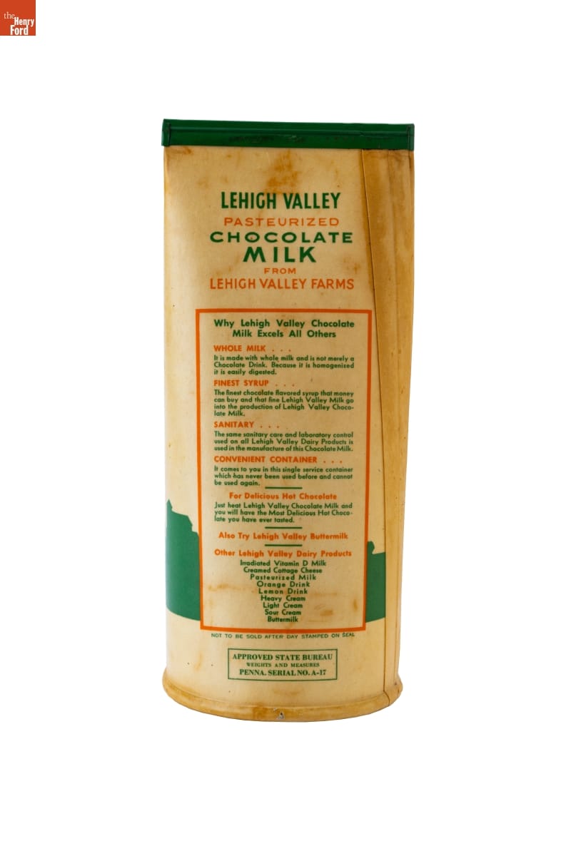 LEHIGH VALLEY / PASTEURIZED / CHOCOLATE / MILK / FROM / LEHIGH VALLEY FARMS / [...] / NOT TO BE SOLD AFTER DAY STAMPED ON SEAL / APPROVED STATE BUREAU / WEIGHTS AND MEASURES / PENNA. SERIAL No. A-17