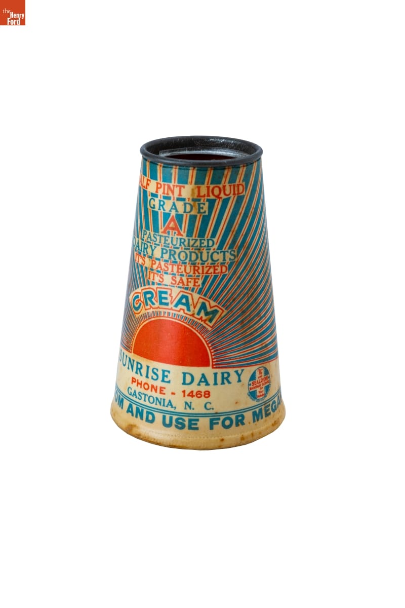 HALF PINT LIQUID / GRADE / A / PASTEURIZED / DAIRY PRODUCT / IT'S PASTEURIZED / IT'S SAFE / CREAM / SUNRISE DAIRY / PHONE 1468 / GASTONIA, N. C. / CUT BOTTOM AND USE FOR MEGAPHONE