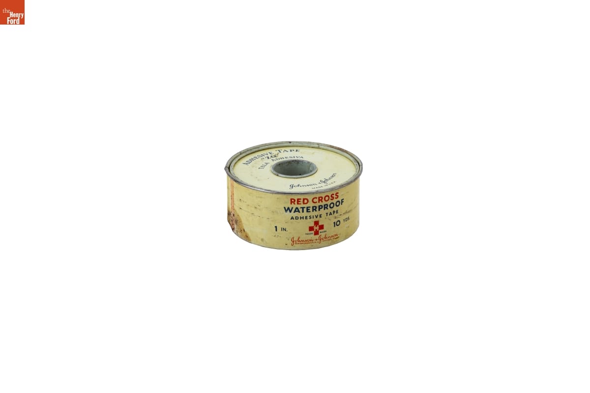 RED CROSS / WATERPROOF / ADHESIVE TAPE / 1 IN. 10 YDS. / J&J / TRADE MARK / Johnson + Johnson / NEW BRUNSWICK, N.J. CHICAGO, ILL.