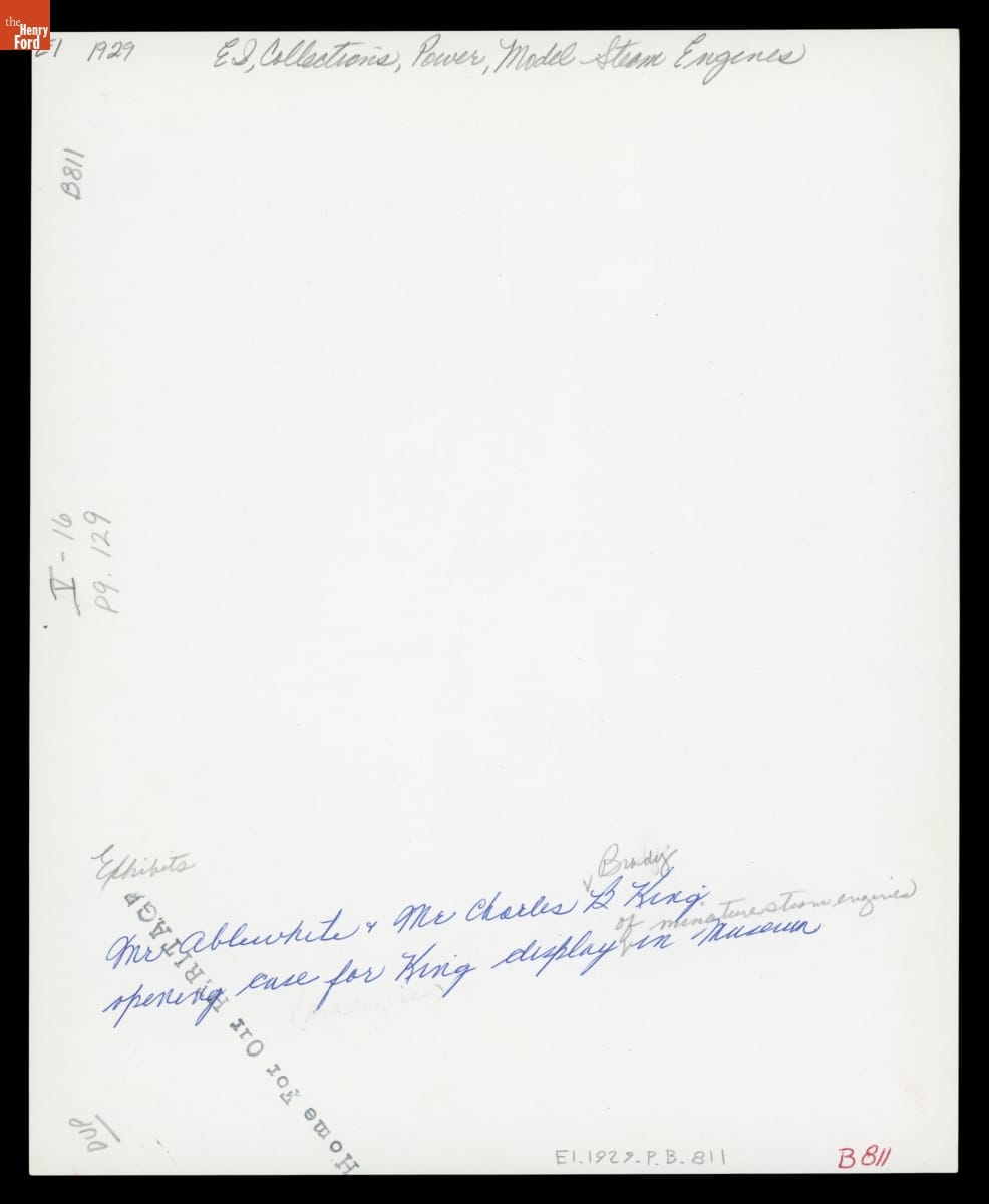 Charles Brady King (right) built and drove the first automobile in Detroit in March 1896, three months before Henry Ford finished his Quadricycle. Many years later, King gifted a collection of model steam engines to Ford's museum. King was photographed with Hayward Ablewhite, the museum's director of interpretation, at the time of the donation.