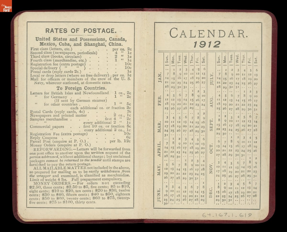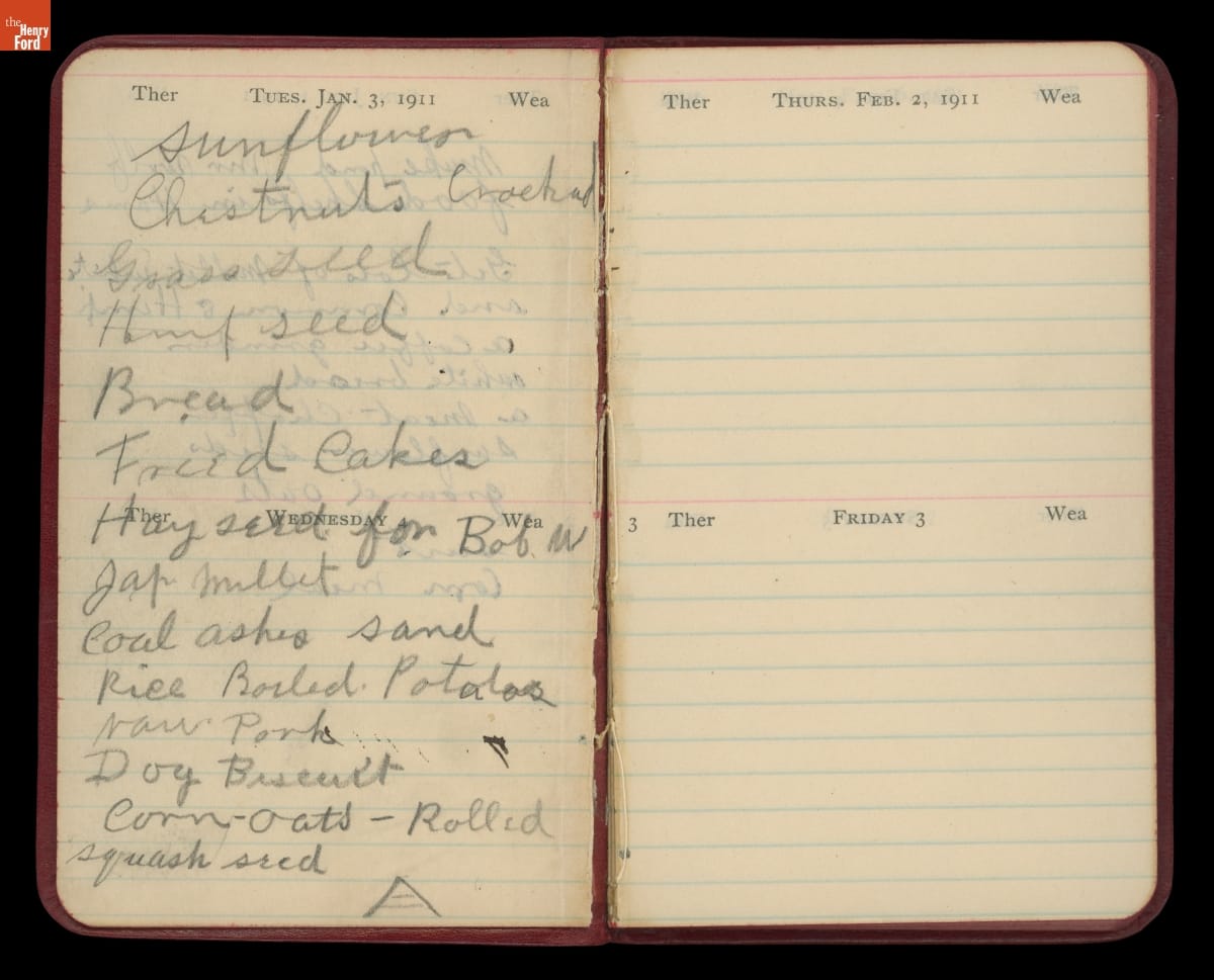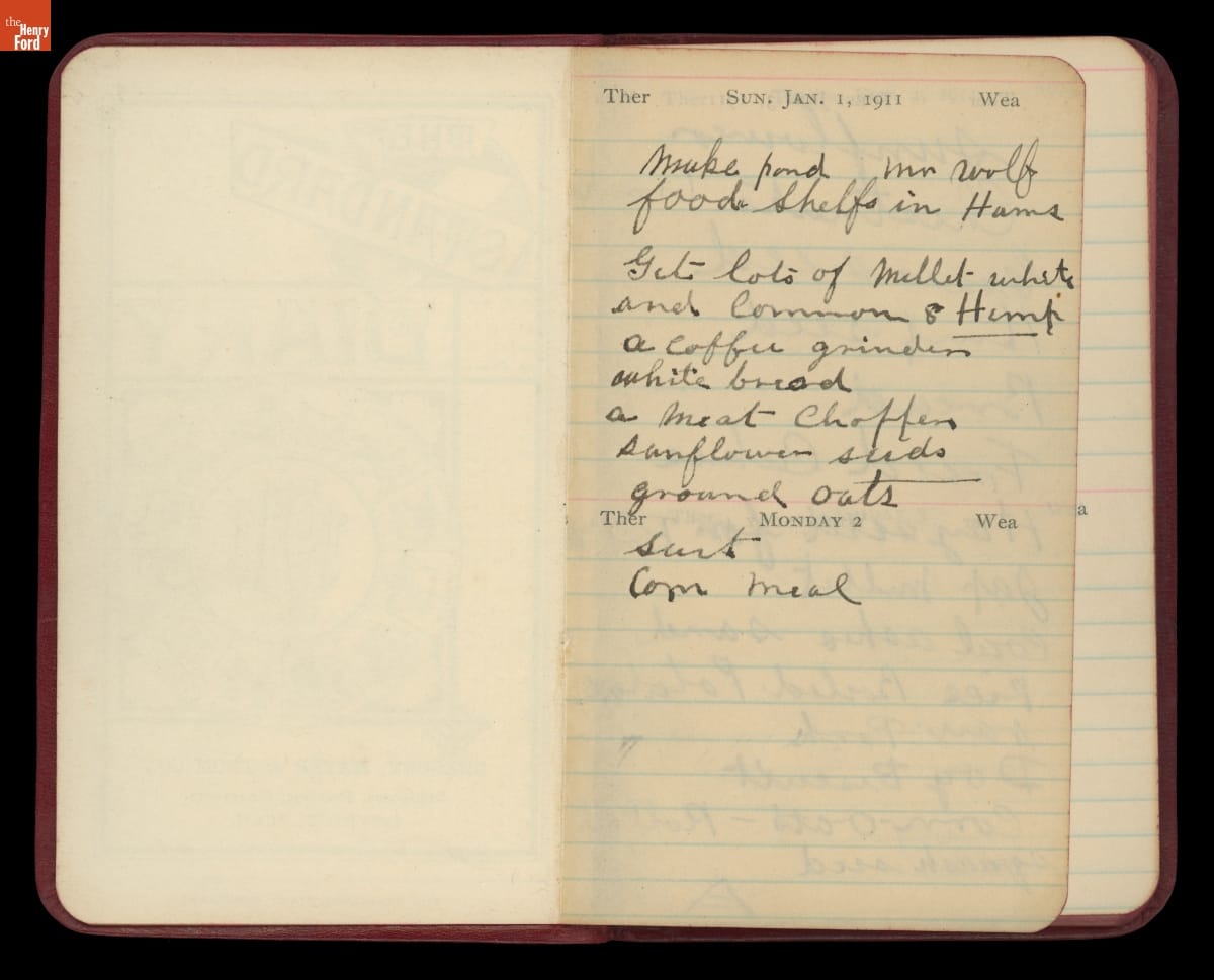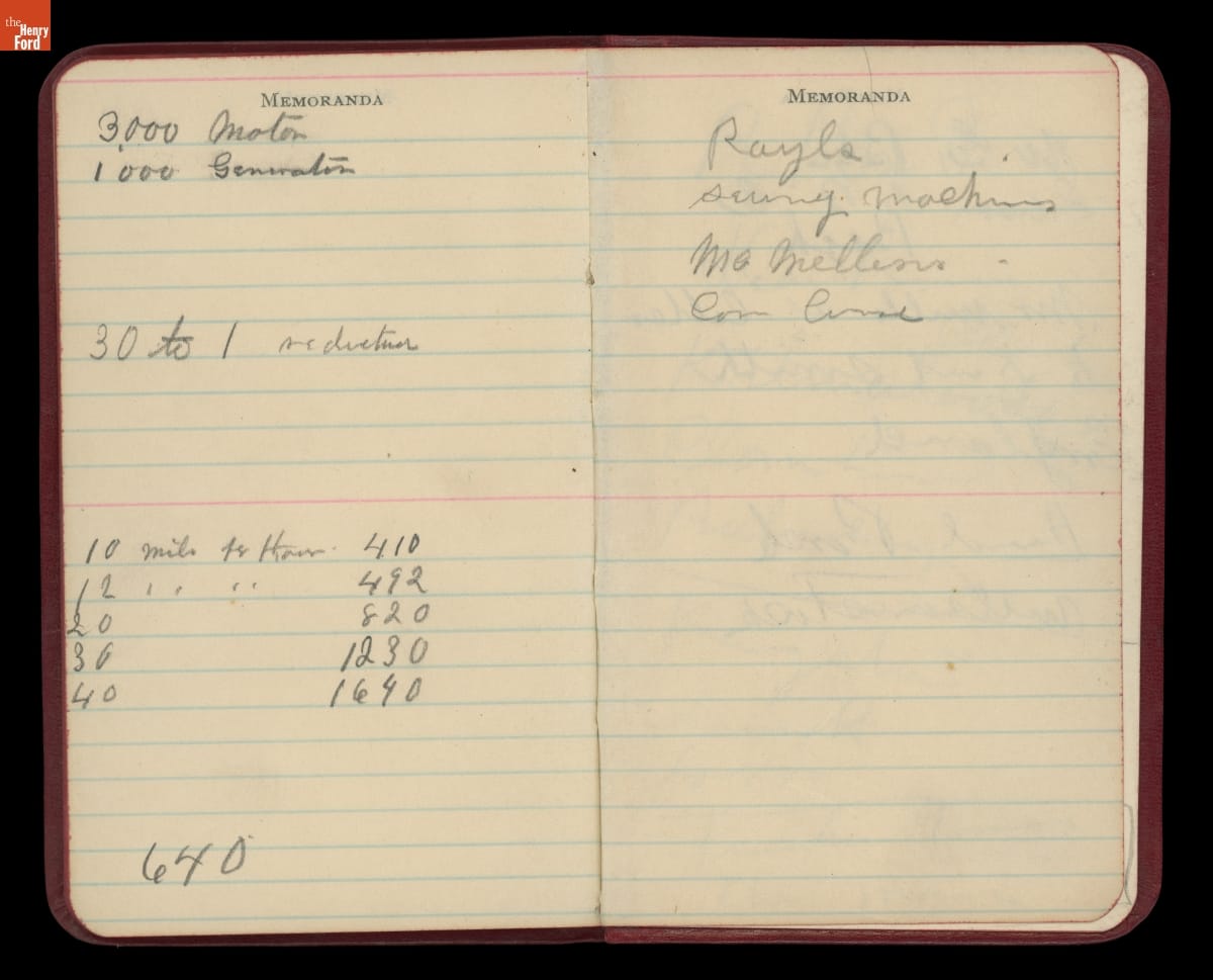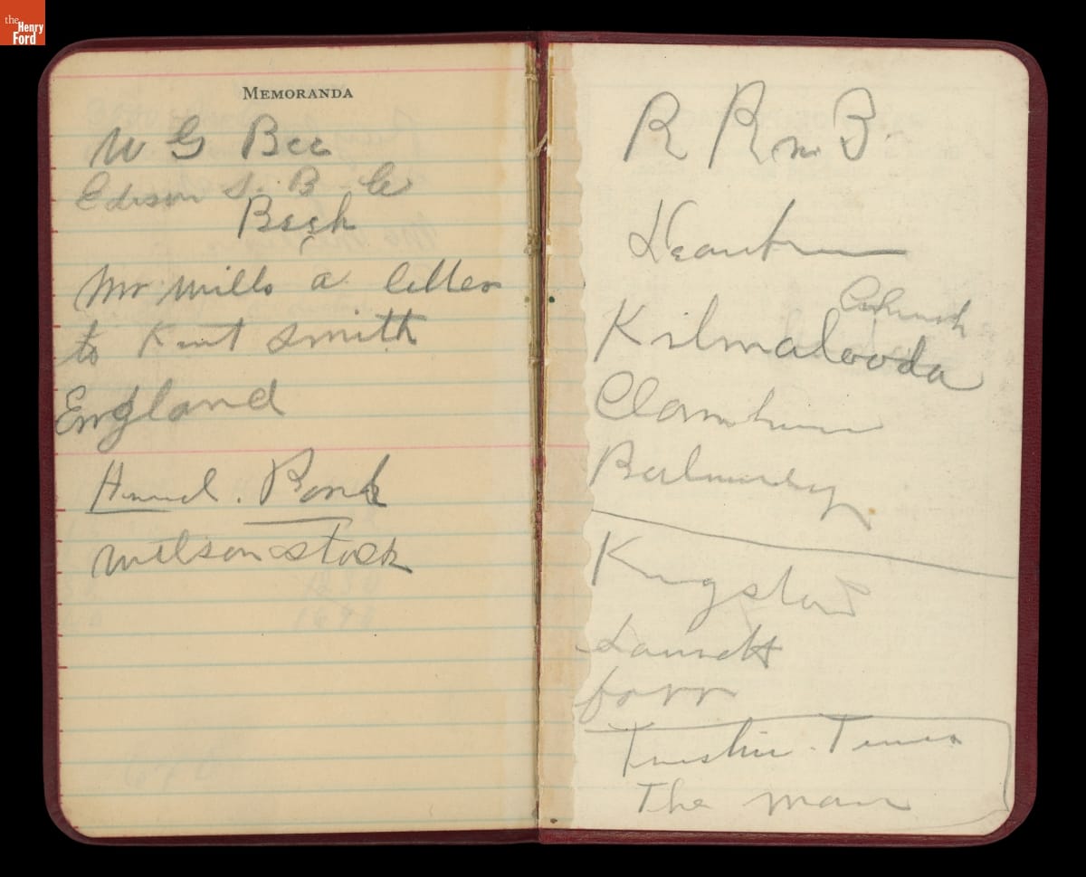 Henry Ford always carried a small notebook to jot down important pieces of information or simple reminders of things to remember. The over 50 small jot books give a sense of a busy man trying to capture information on the fly. The contents vary from questions to ask Thomas Edison to names and addresses to grocery lists.