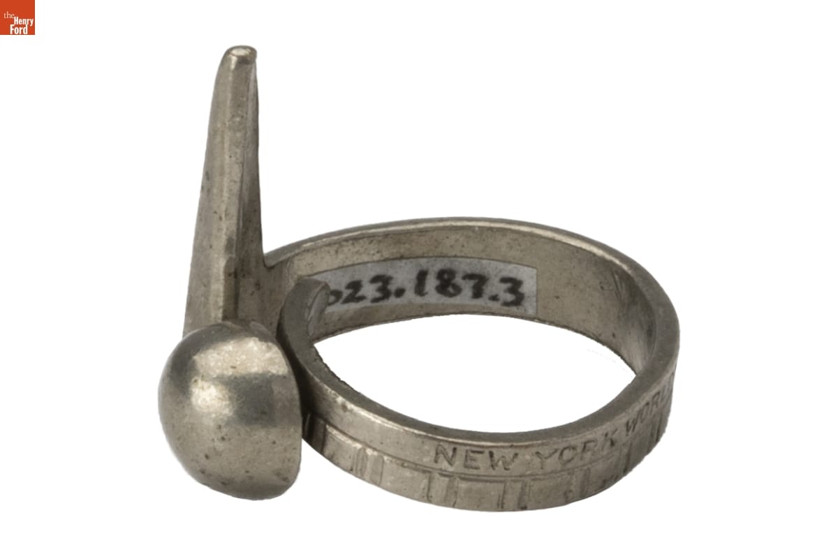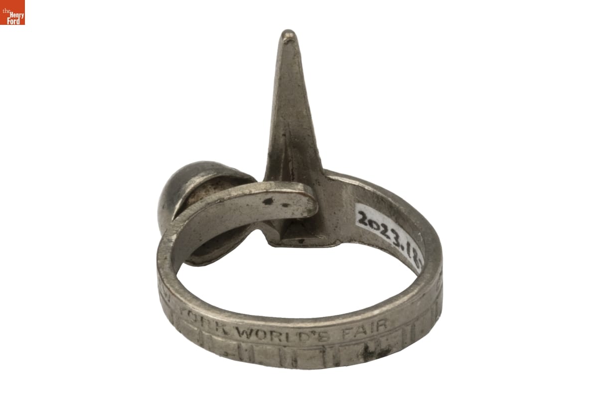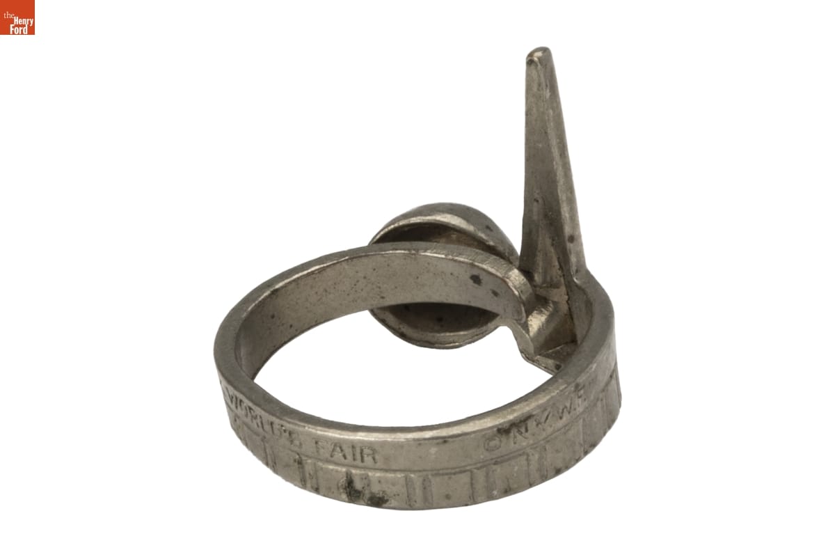 The Trylon and Perisphere were iconic symbols of the 1939-1940 New York World's Fair. The architectural pairing represented the fair's utopian theme, "Building the World of Tomorrow." Many souvenirs from the fair, like this ring, used the Trylon and Perisphere image.