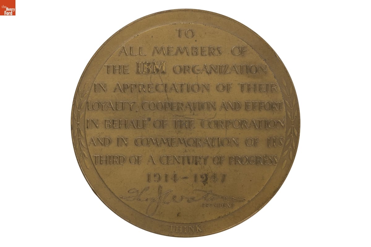 International Business Machines (IBM) produced this medallion in appreciation of their employees' loyalty, cooperation, and efforts towards the success of the organization and its progress for a third of a century. Noted sculptor Carl Paul Jennewein designed the medallion with a bust of IBM's president, Thomas J. Watson, on the front and the tribute with IBM's iconic slogan, "THINK," on the reverse.