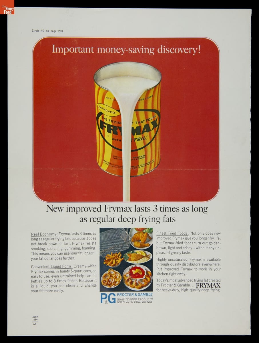 "New Improved Frymax Lasts 3 Times as Long as Regular Deep Frying Fats," June 1964