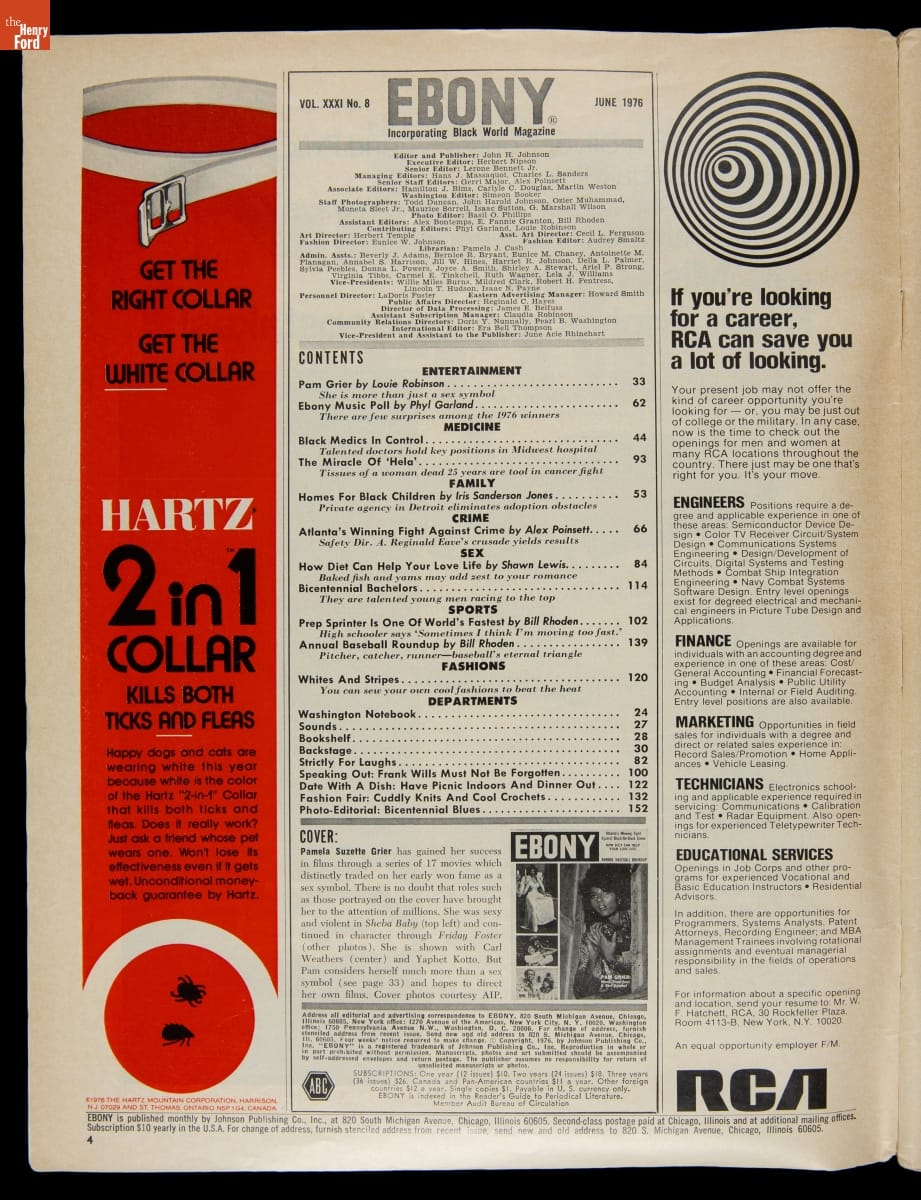 Published since 1945, Ebony is a monthly news, culture, and entertainment magazine for the African American community. Coverage includes politics, food, fashion and beauty. Like many Ebony covers, this one showcases a prominent public figure: actress Pam Grier. The issue reflects the general interests of Ebony’s readership in June 1976, just ahead of the American Bicentennial.