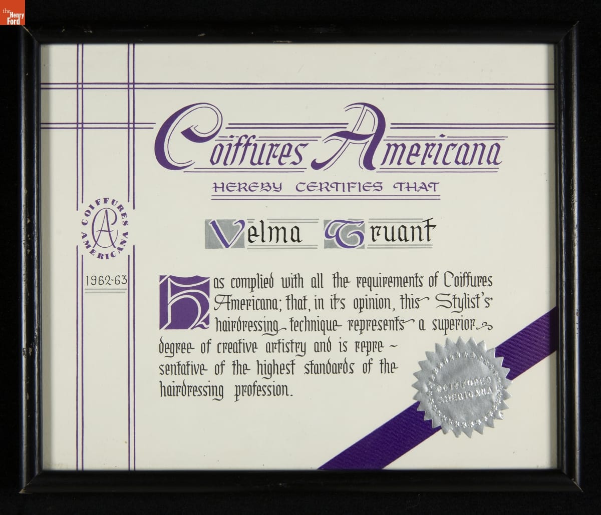Coiffures Americana Certificate Awarded to Velma Truant, 1962-1963
