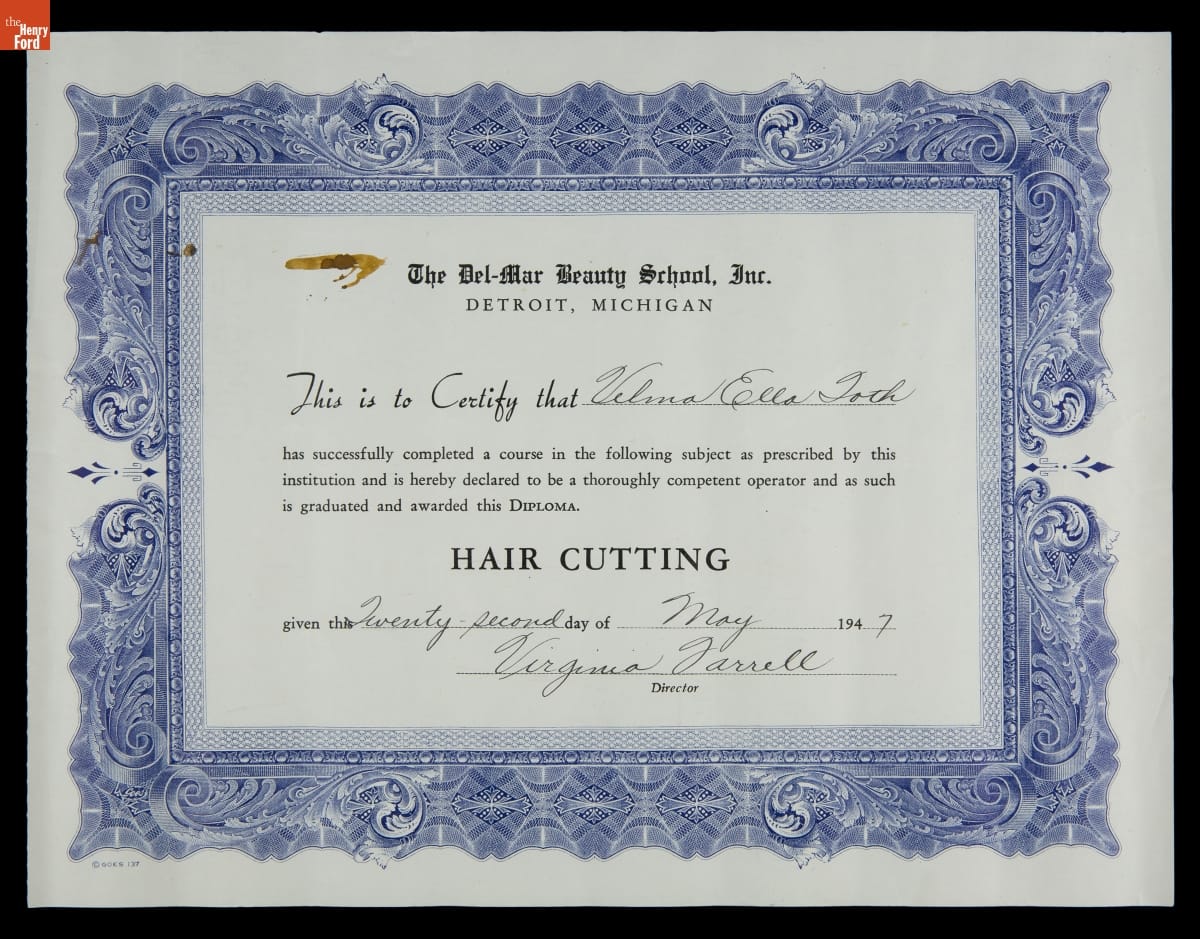 The Del-Mar Beauty School, Inc. Hair Cutting Diploma Awarded to Velma Ella Toth, 1947