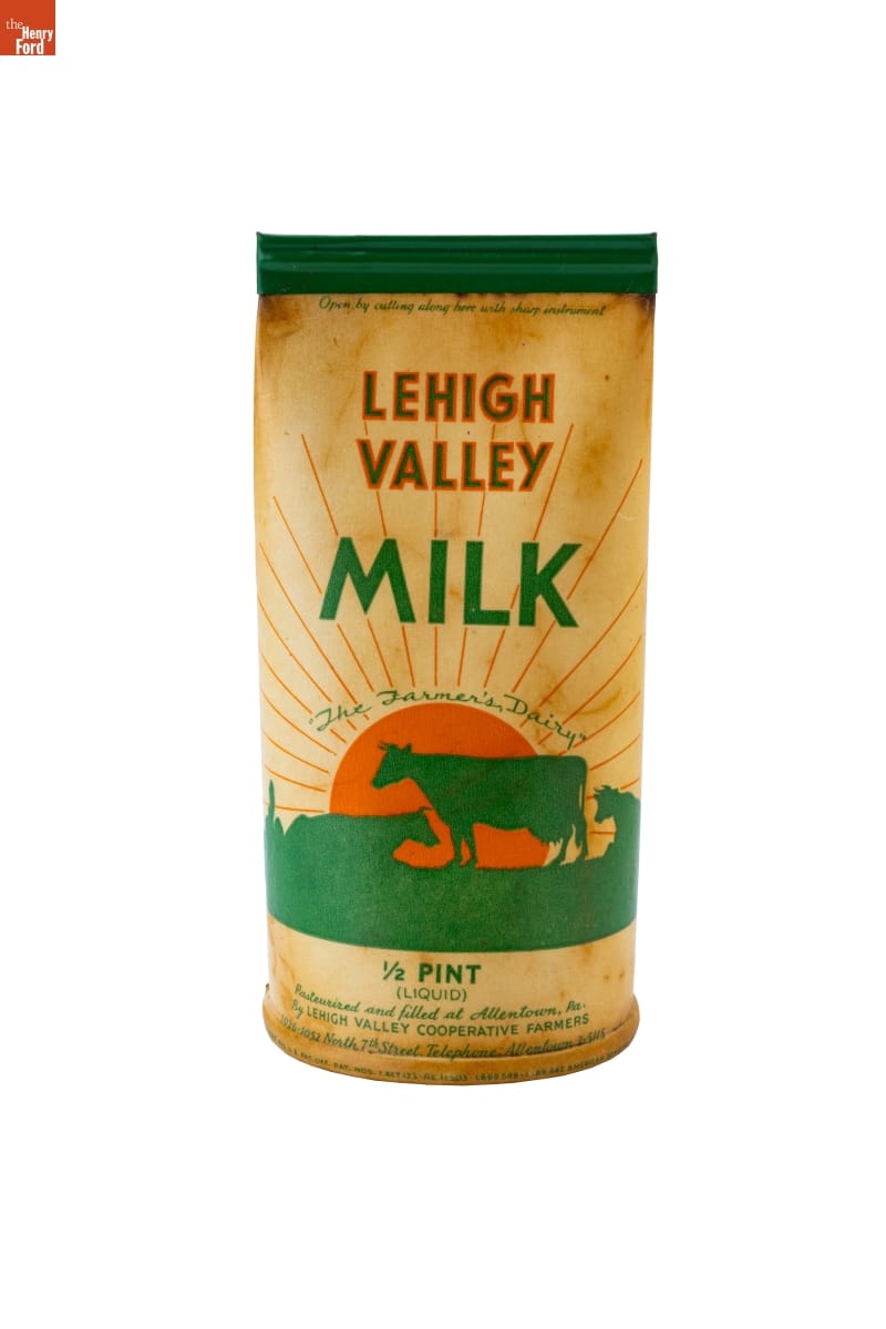 Open by cutting along here with sharp instrument / LEHIGH / VALLEY / MILK / "The Farmer's Dairy" / 1/2 PINT / (LIQUID) / Pasteurized and filled at Allentown, Pa. / by LEHIGH VALLEY COOPERATIVE FARMERS / 1026-1052 North 7th Street. Telephone: Allentown 3-5115