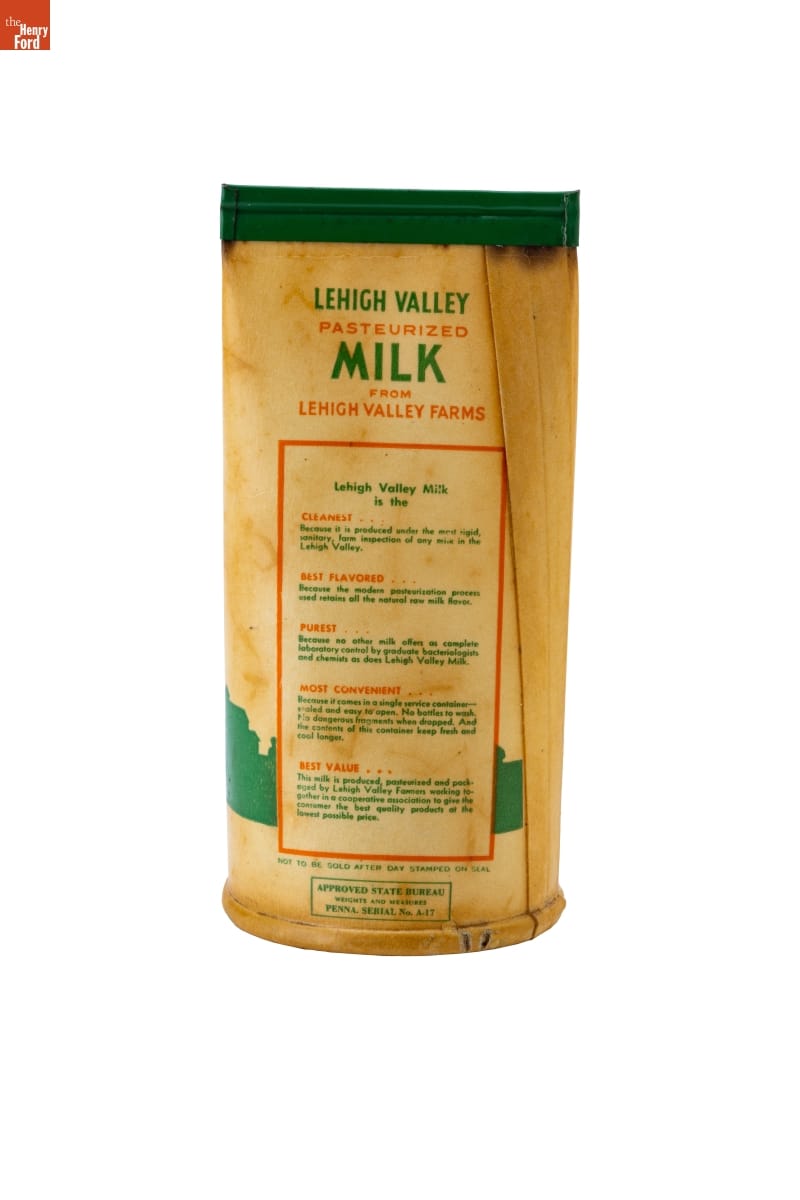 LEHIGH VALLEY / PASTEURIZED / MILK / FROM / LEHIGH VALLEY FARMS / [...] / NOT TO BE SOLD AFTER DAY STAMPED ON SEAL / APPROVED STATE BUREAU / WEIGHTS AND MEASURES / PENNA. SERIAL No. A-17