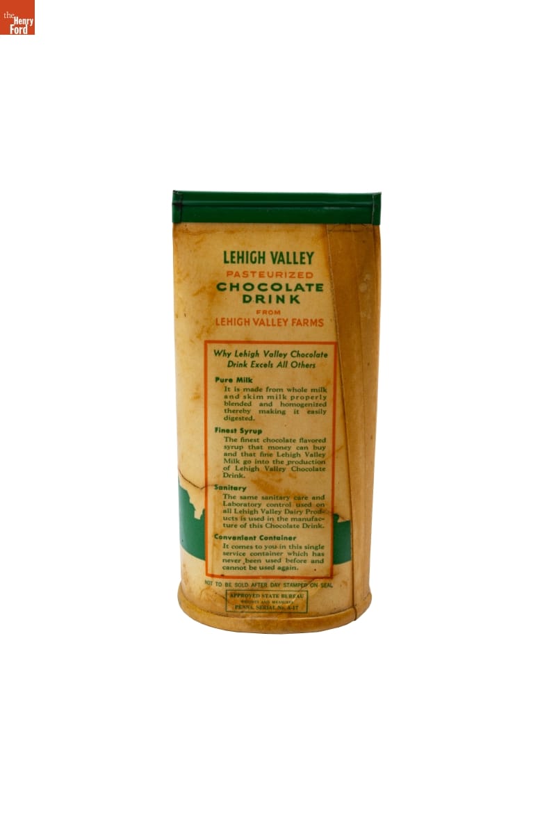 LEHIGH VALLEY / PASTEURIZED / CHOCOLATE / DRINK / FROM / LEHIGH VALLEY FARMS / [...] / NOT TO BE SOLD AFTER DAY STAMPED ON SEAL / APPROVED STATE BUREAU / WEIGHTS AND MEASURES / PENNA. SERIAL No. A-17