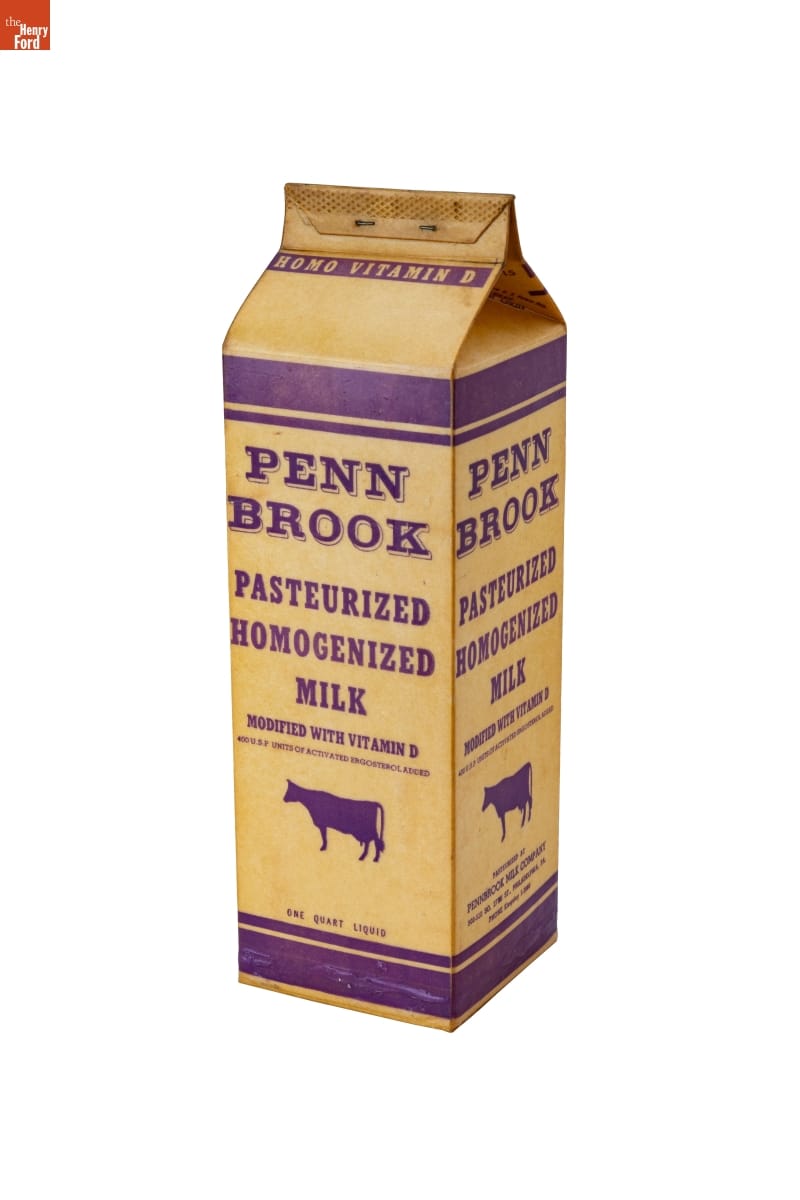 The quest for a shatter-proof milk container prompted John Van Wormer to patent a paper carton in 1915. Many processors and distributors continued to use breakable glass bottles, but, after 1937, mechanized production made the disposable, wax-coated folded cartons inexpensive and indispensable liquid containers. The iconic design, a box with a gable-end top with a pouring or drinking spout, remains the industry standard today.
