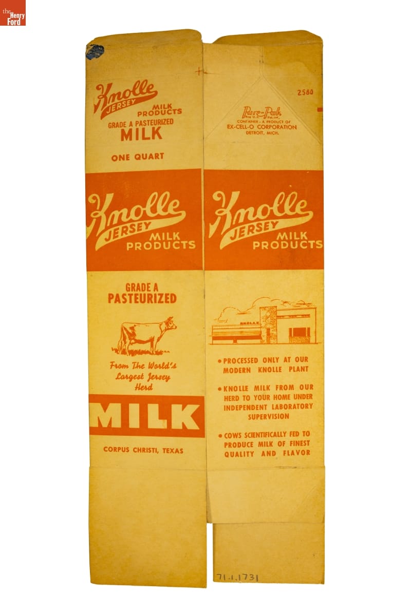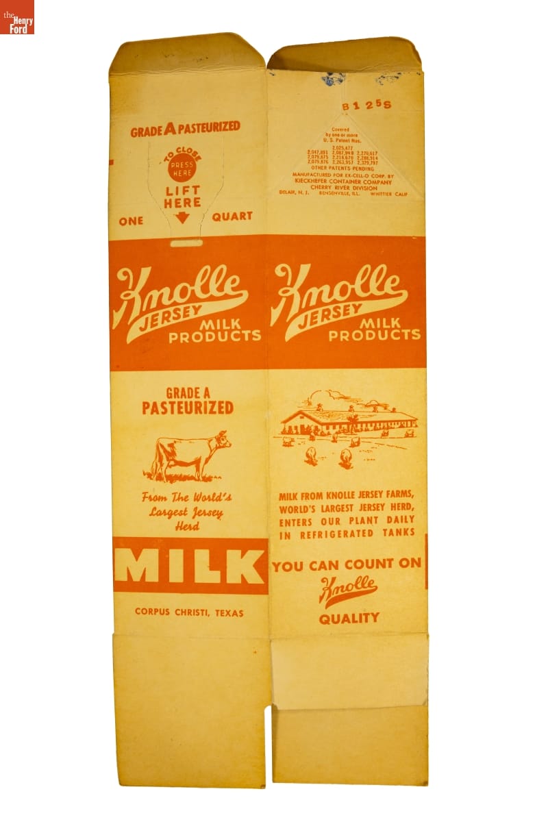 Manufactured for Ex-Cell-O Corporation, Detroit, Michigan, by the Kieckhefer Container Company, Cherry River Division, Delair, New Jersey, Bensenville, Illinois, and Whittier, California, for Knolle Jersey Milk Products, Corpus Christi, Texas.
