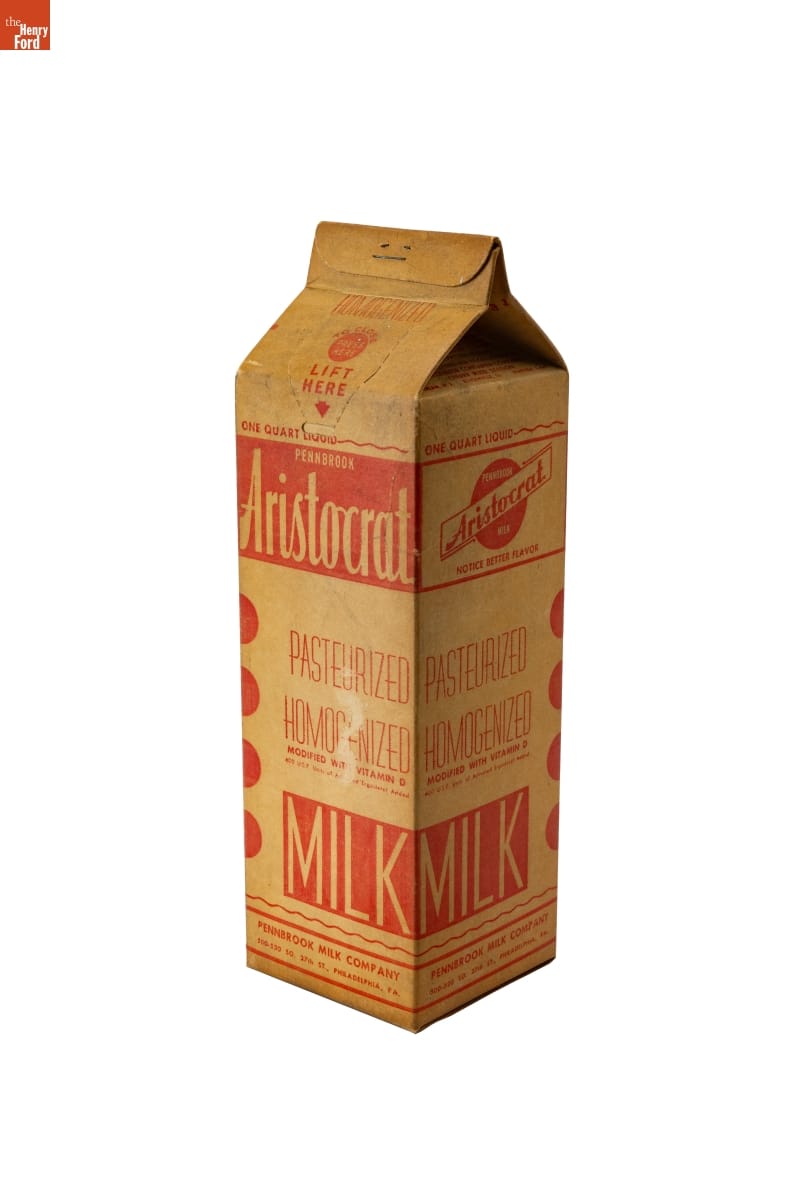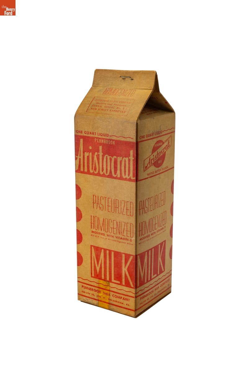 The quest for a shatter-proof milk container prompted John Van Wormer to patent a paper carton in 1915. Many processors and distributors continued to use breakable glass bottles, but, after 1937, mechanized production made the disposable, wax-coated folded cartons inexpensive and indispensable liquid containers. The iconic design, a box with a gable-end top with a pouring or drinking spout, remains the industry standard today.