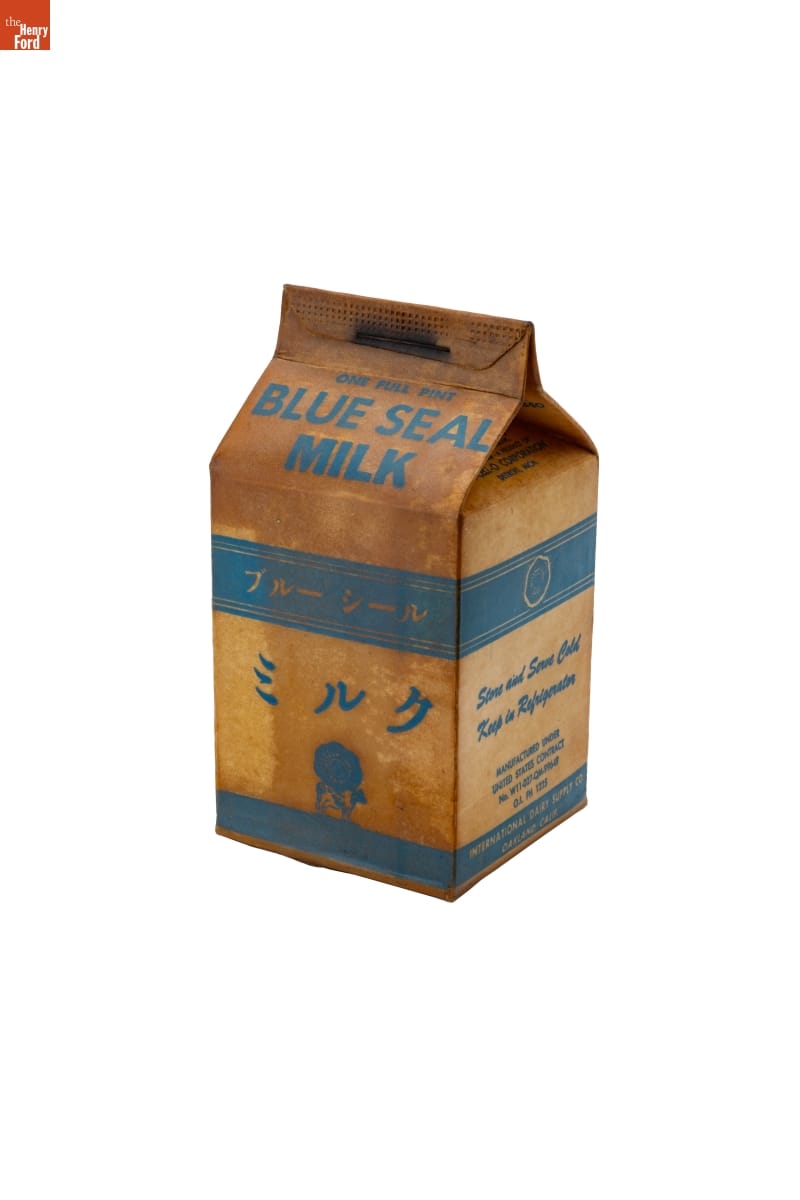 The quest for a shatter-proof milk container prompted John Van Wormer to patent a paper carton in 1915. Many processors and distributors continued to use breakable glass bottles, but, after 1937, mechanized production made the disposable, wax-coated folded cartons inexpensive and indispensable liquid containers. The iconic design, a box with a gable-end top with a pouring or drinking spout, remains the industry standard today.