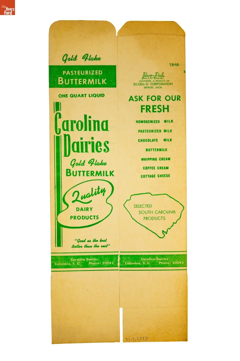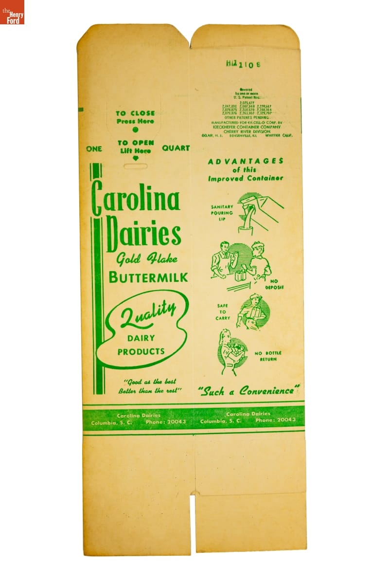 Manufactured for Ex-Cell-O Corporation, Detroit, Michigan, by the Kieckhefer Container Company, Cherry River Division, Delair, New Jersey, Bensenville, Illinois, and Whittier, California, for Carolina Dairies, Columbia, South Carolina.