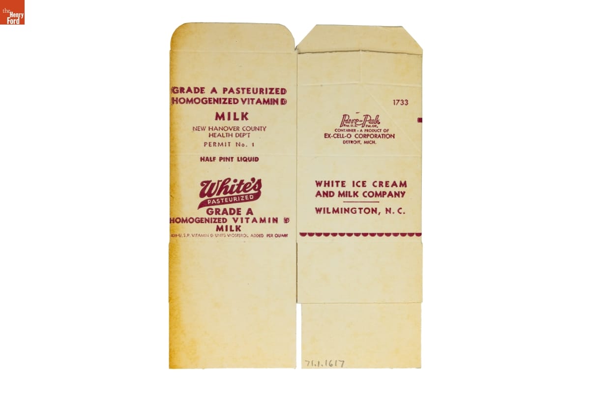 Manufactured for Ex-Cell-O Corporation, Detroit, Michigan, by the Kieckhefer Container Company, Cherry River Division, Delair, New Jersey, Bensenville, Illinois, and Whittier, California, for White Ice Cream and Milk Company, Wilmington, North Carolina.