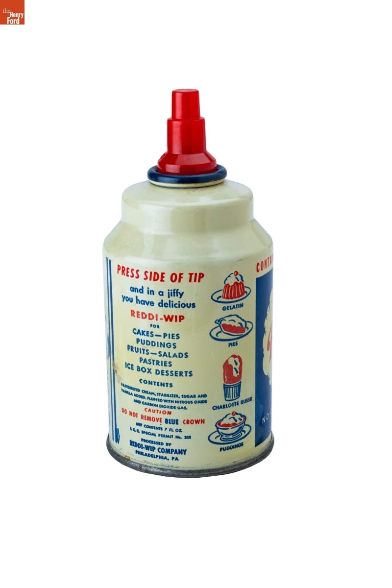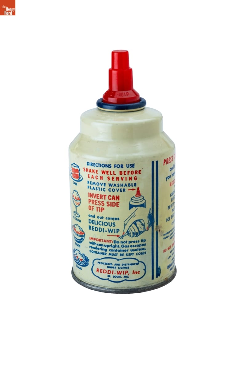 CAKE / ICE CREAM / FRUITS / SALADS / DIRECTIONS FOR USE / SHAKE WELL BEFORE / EACH SERVING / REMOVE WASHABLE / PLASTIC COVER / INVERT CAN / PRESS SIDE / OF TIP / and out comes / DELICIOUS / REDDI-WIP / Important: Do not press tip / with can upright. Gas escapes / rendering container useless. / CONTAINER MUST BE KEPT COLD! / PROCESSED AND DISTRIBUTED / UNDER LICENSE / REDDI-WIP, Inc / ST. LOUIS, MO.