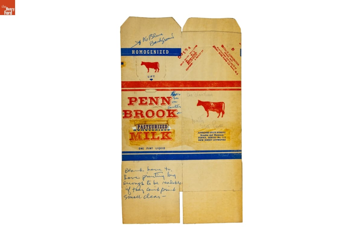 The quest for a shatter-proof milk container prompted John Van Wormer to patent a paper carton in 1915. Many processors and distributors continued to use breakable glass bottles, but, after 1937, mechanized production made the disposable, wax-coated folded cartons inexpensive and indispensable liquid containers. The iconic design, a box with a gable-end top with a pouring or drinking spout, remains the industry standard today.