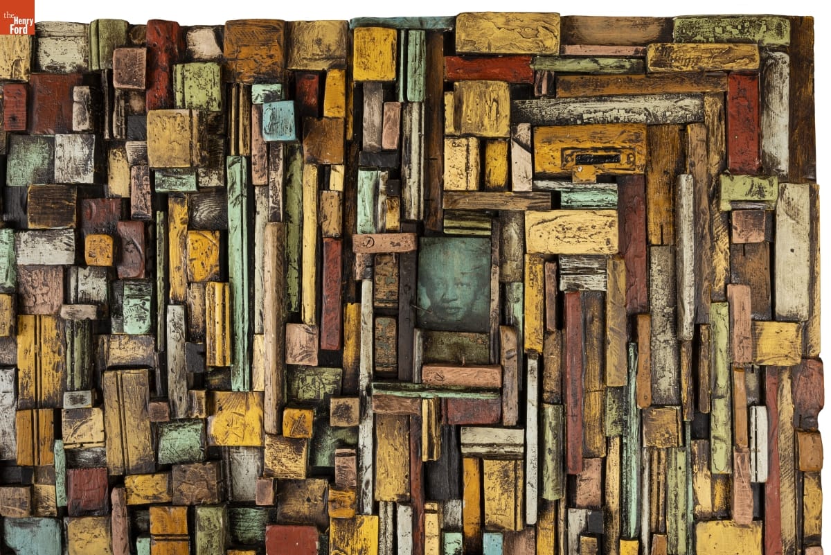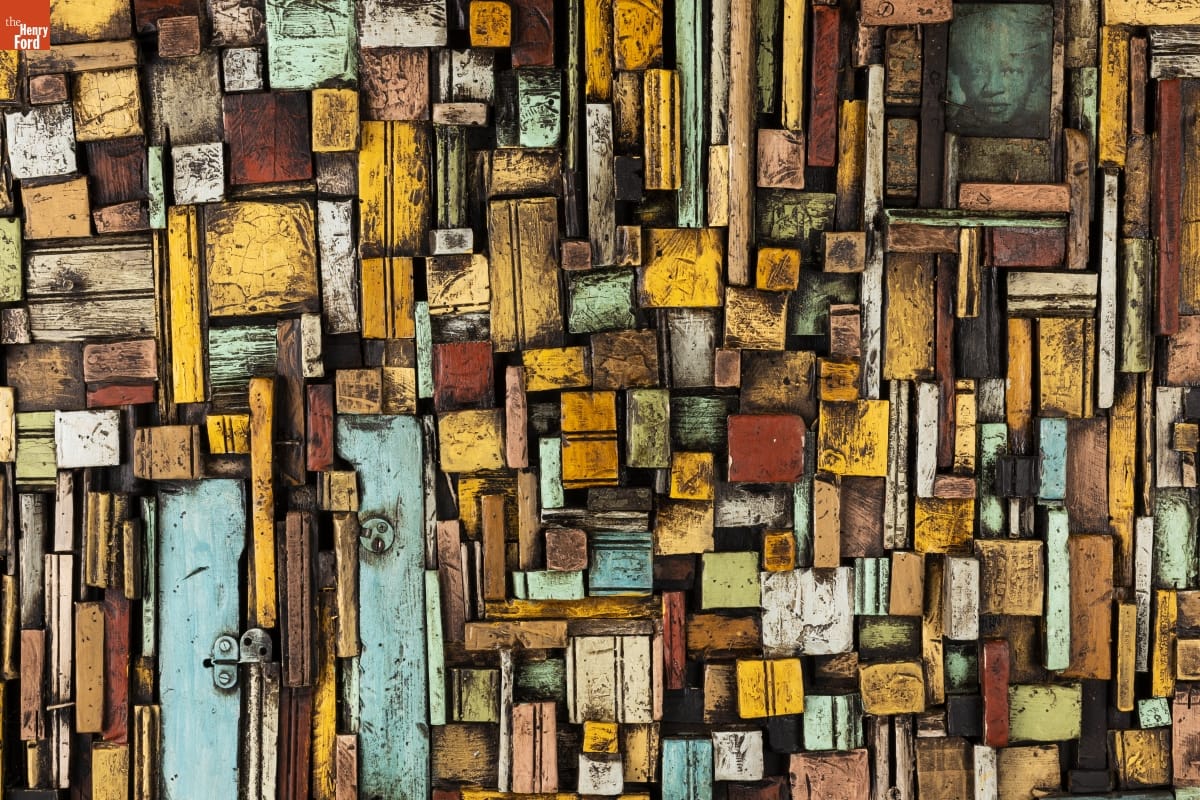 New Orleans artist Jean-Marcel St. Jacques creates "wooden quilts" like this one using wood and other debris from his Hurricane Katrina-damaged home. The style of his work honors both his quilter great-grandmother – to whom this piece is particularly dedicated – and his great-grandfather, who was a junk collector and hoodoo practitioner.
