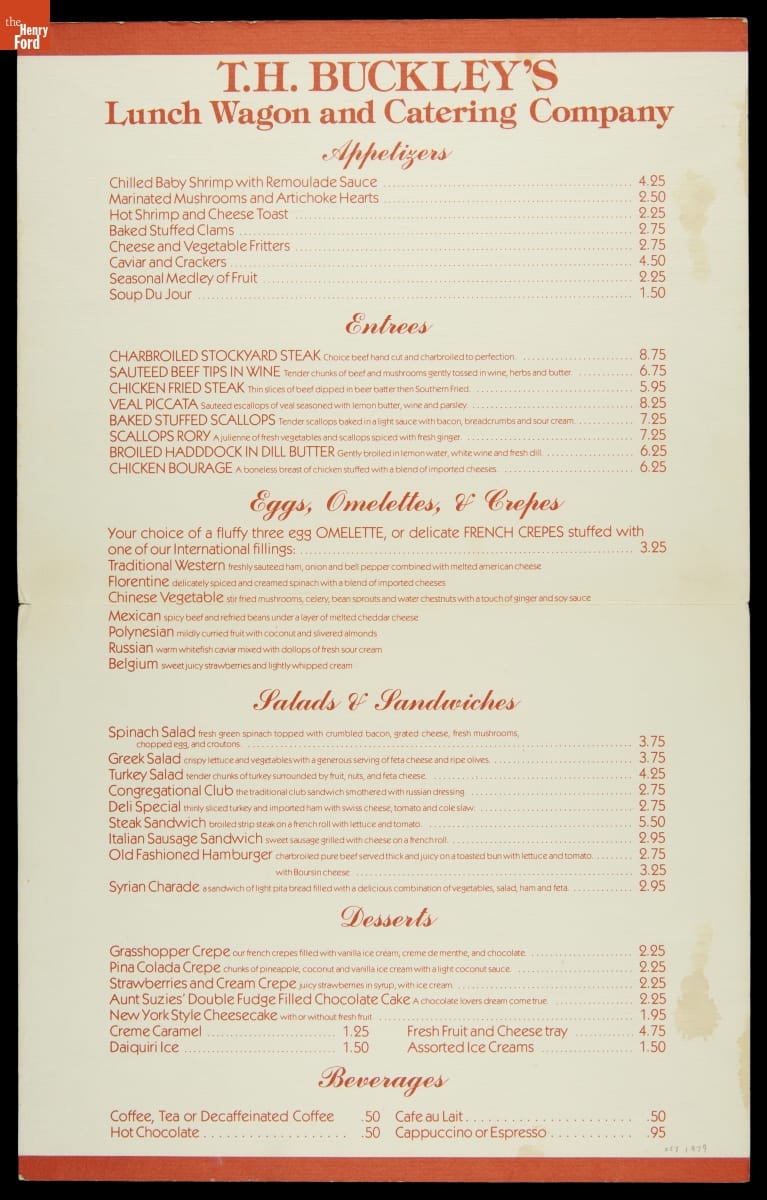 T.H. Buckley Lunch Wagon and Catering Company Menu, October 1979