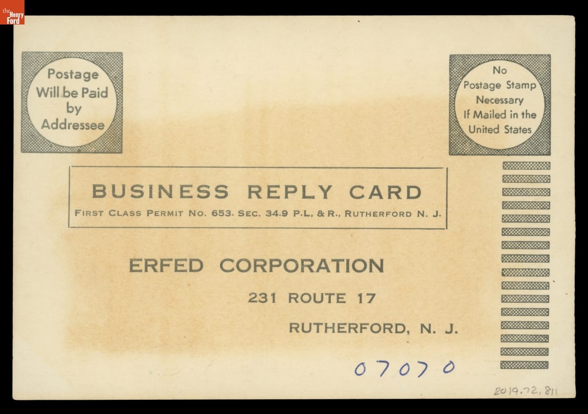 Business Reply Card for Erfed Corp., 1956-1975