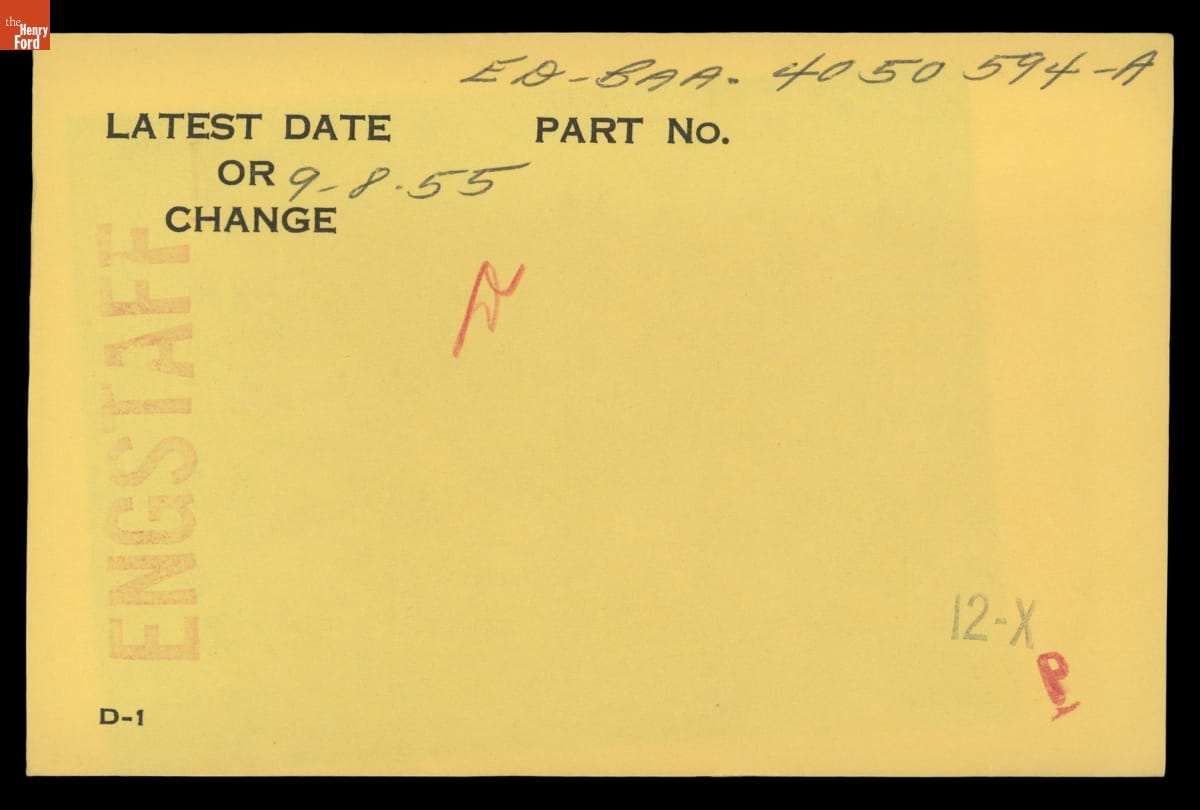 The Ford Motor Company created over a million parts drawings from 1903 to 1957. Many of these drawings specify engineering requirements for the components of Ford-made vehicles--including automobiles, trucks, tractors, military vehicles and Tri-motor airplanes. Others document assembly components, stages of casting and forging, or experimental designs. Beginning in the 1940s, Ford transferred the drawings to microfilm.
