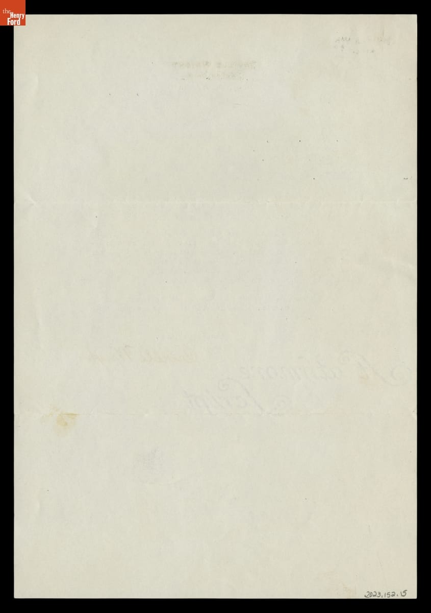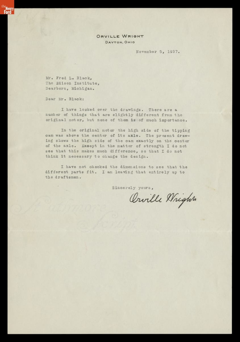 Henry Ford acquired the Wright brothers' home and cycle shop in 1936, and he relocated the buildings from Dayton, Ohio, to Greenfield Village in Dearborn, Michigan. Orville Wright consulted on the project to ensure accuracy. In this letter to Ford's associate Fred Black, Wright commented on drawings for a replica of the engine used in the brothers' 1903 Flyer airplane.