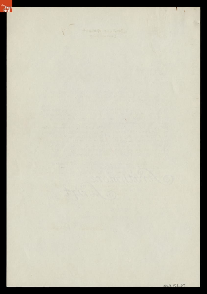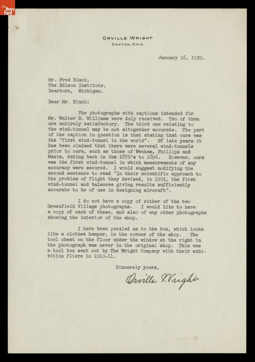 Henry Ford acquired the Wright brothers' home and cycle shop in 1936, and he relocated them from Dayton, Ohio, to his Greenfield Village museum in Dearborn, Michigan. Orville Wright consulted on the project to ensure accuracy. In this letter, Wright suggested corrections to text about the brothers' 1901 wind tunnel, and he questioned the placement of a toolbox in the shop.