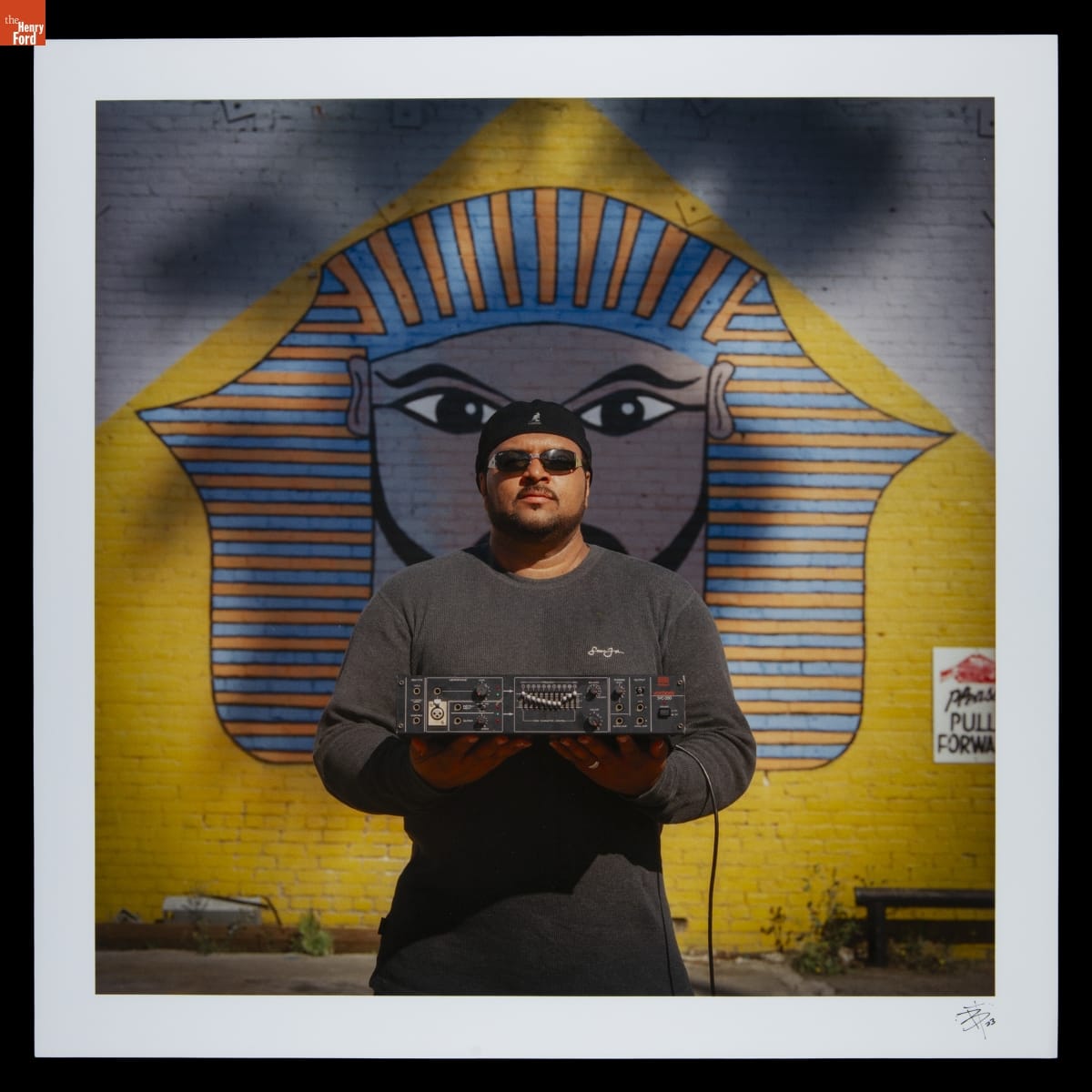 B+ (Brian Cross) is an Irish-born, LA-based photographer and filmmaker. Since the 1990s, he has chronicled underground hip hop, rap, jazz, cumbia, and reggae music scenes. A visual cartographer of sound culture, B+ captures moments of contemplation and inspiration within creative lives. Here, electro music artist The Egyptian Lover holds a vocoder device in front of his Los Angeles studio.