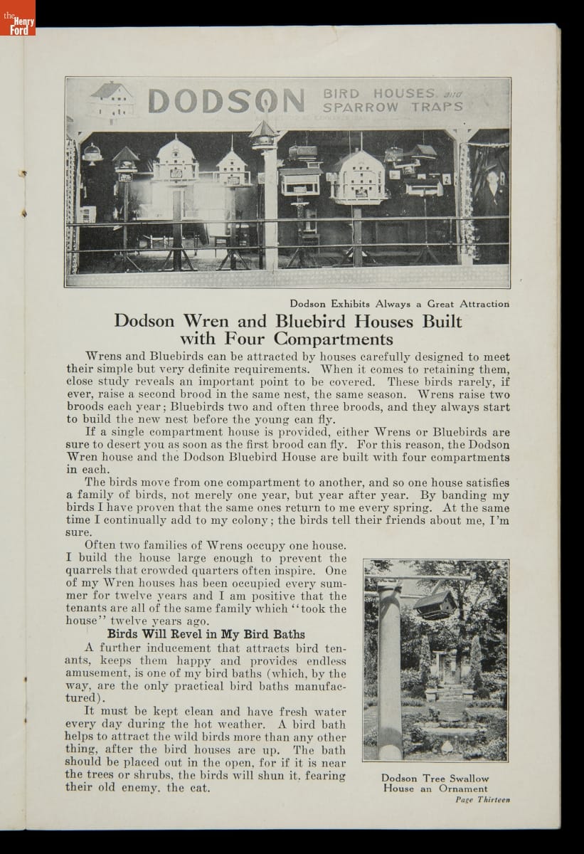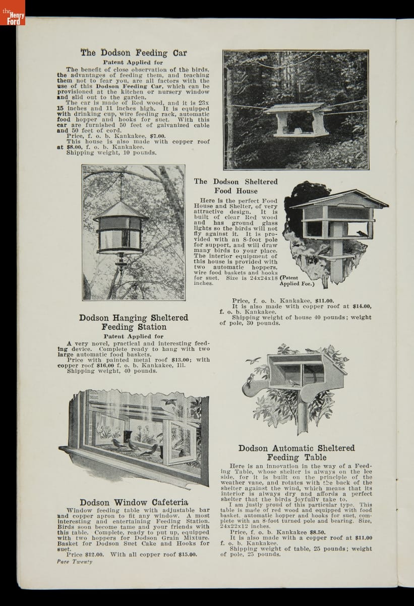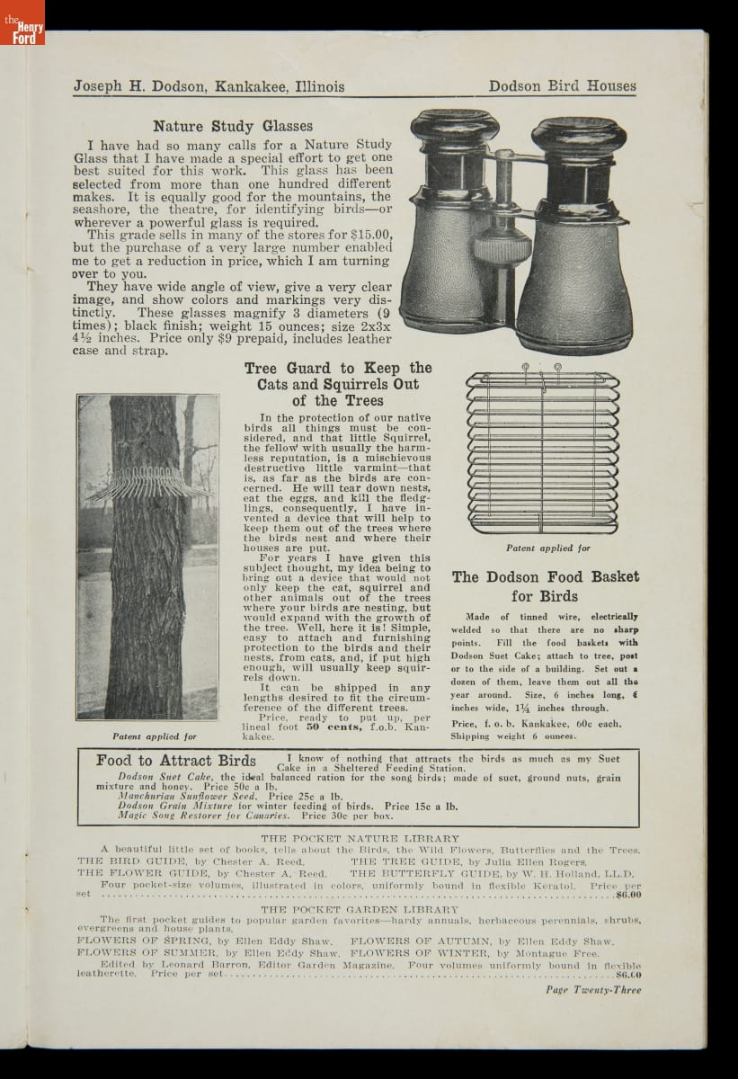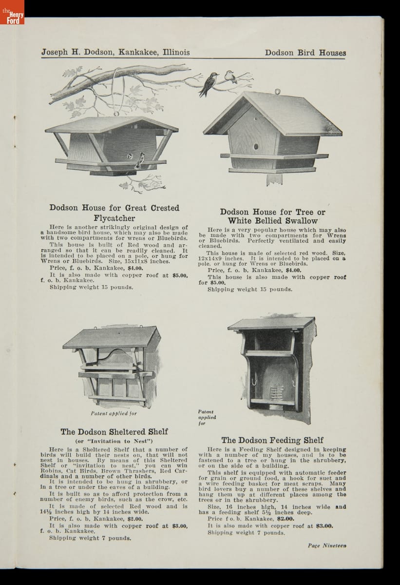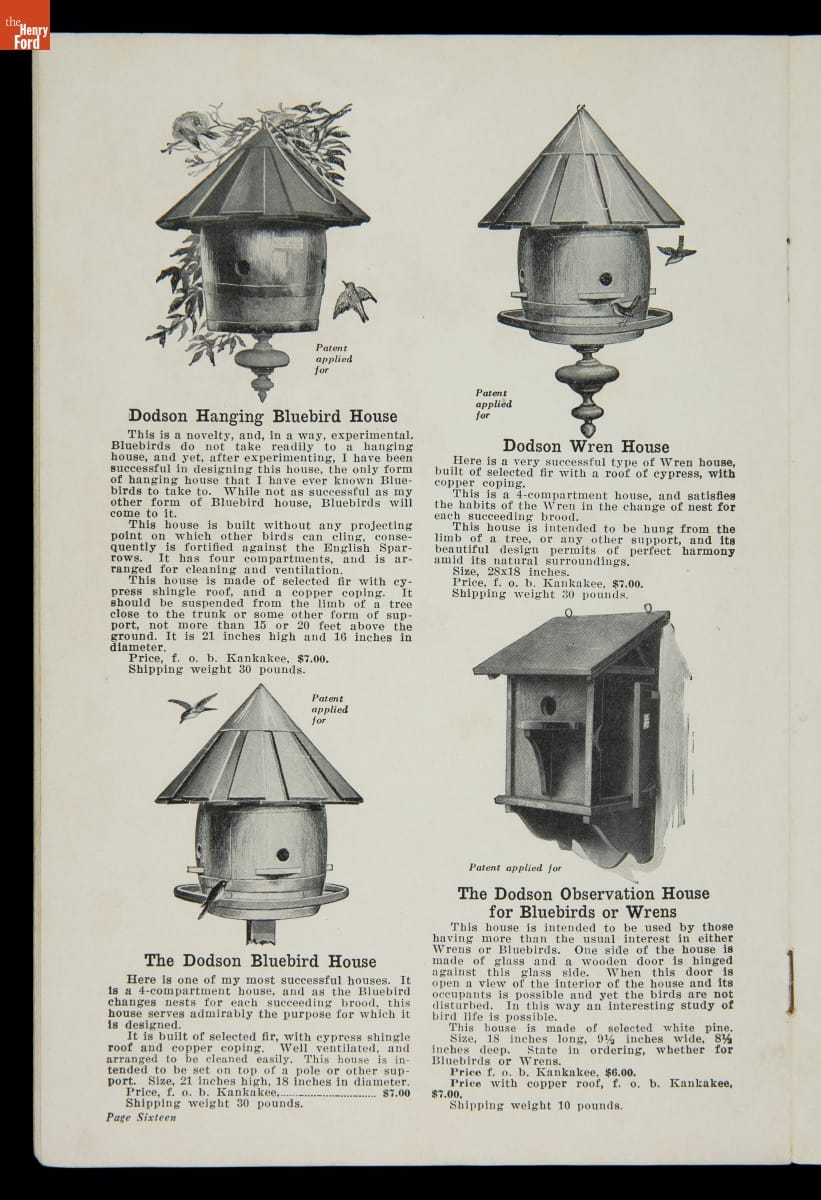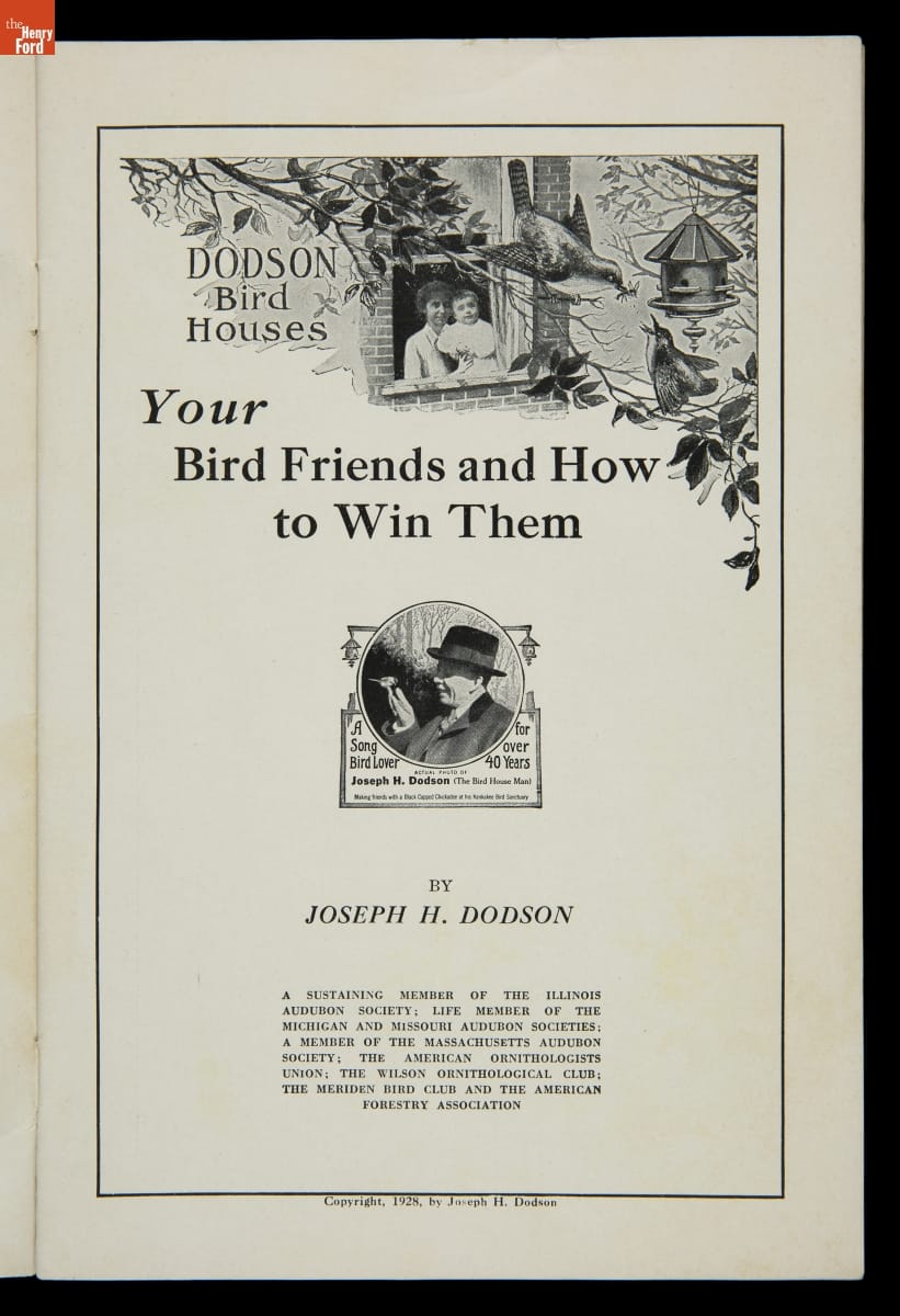 Joseph Dodson used his observations of songbird behavior to design products for his company, Dodson Bird Houses. In the company's catalog, Your Bird Friends and How to Win Them (1928), customers could choose from dozens of unique houses, feeders, and baths designed for different species' needs. It also featured essays on how to attract and care for wild birds.