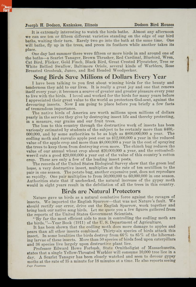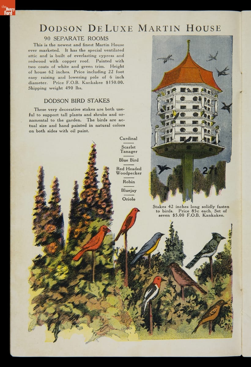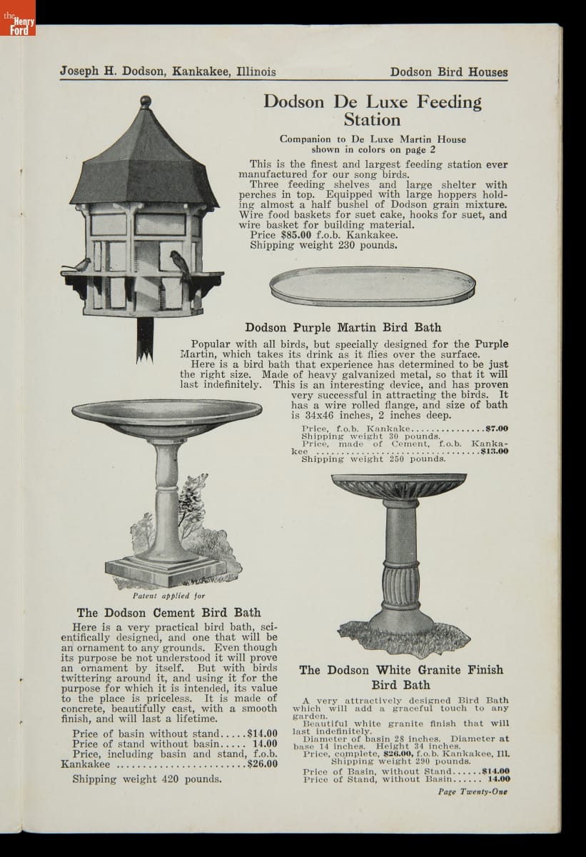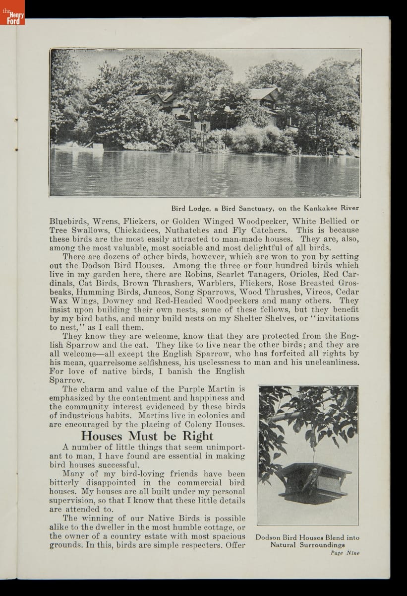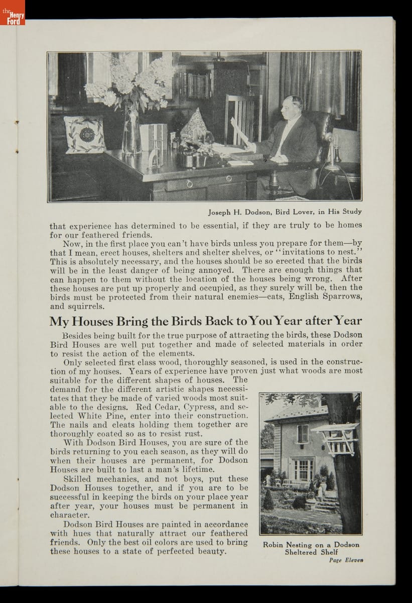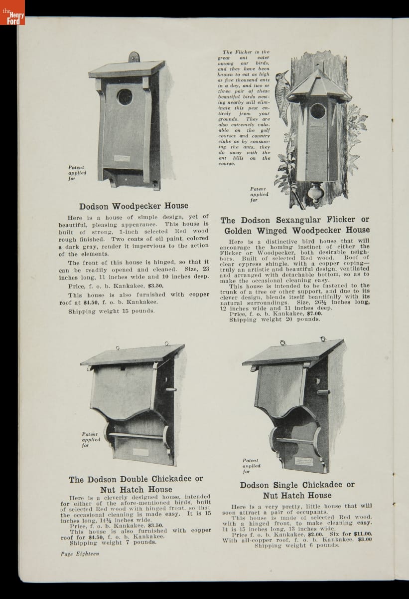 Joseph Dodson used his observations of songbird behavior to design products for his company, Dodson Bird Houses. In the company's catalog, Your Bird Friends and How to Win Them (1928), customers could choose from dozens of unique houses, feeders, and baths designed for different species' needs. It also featured essays on how to attract and care for wild birds.