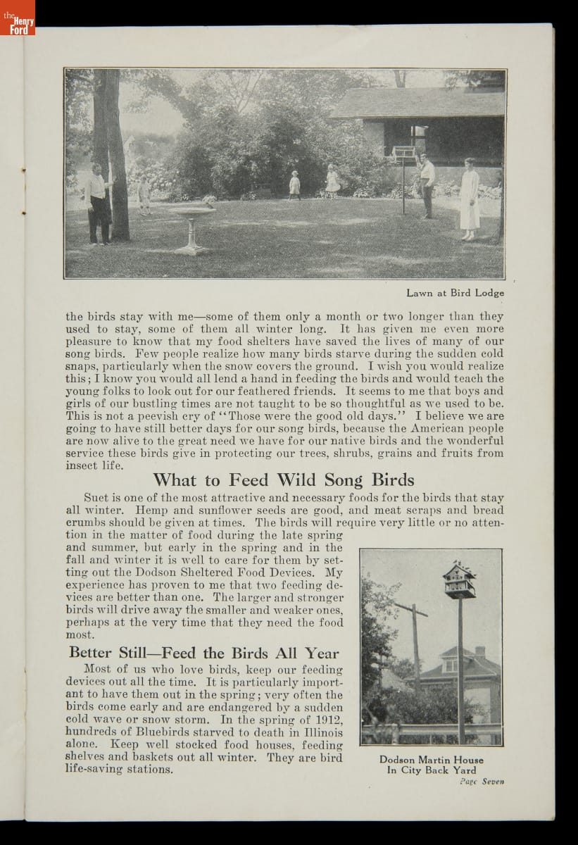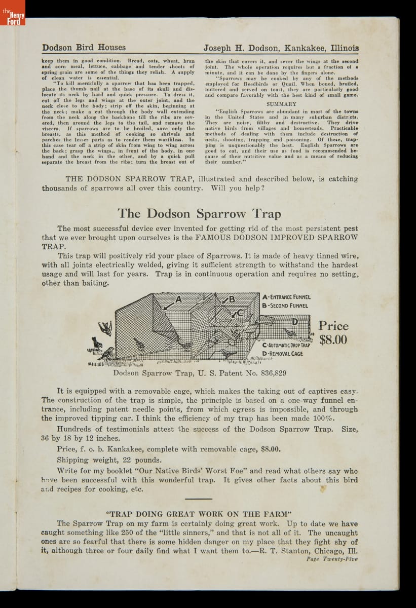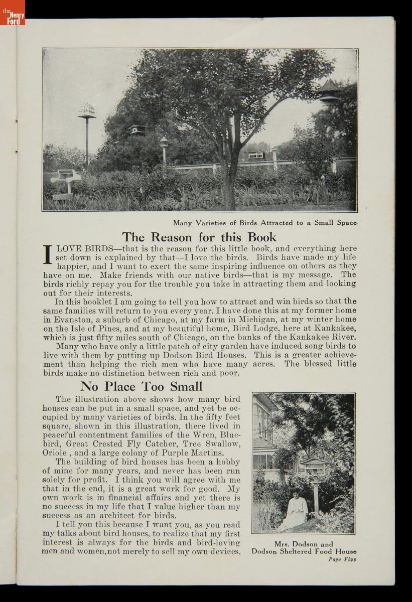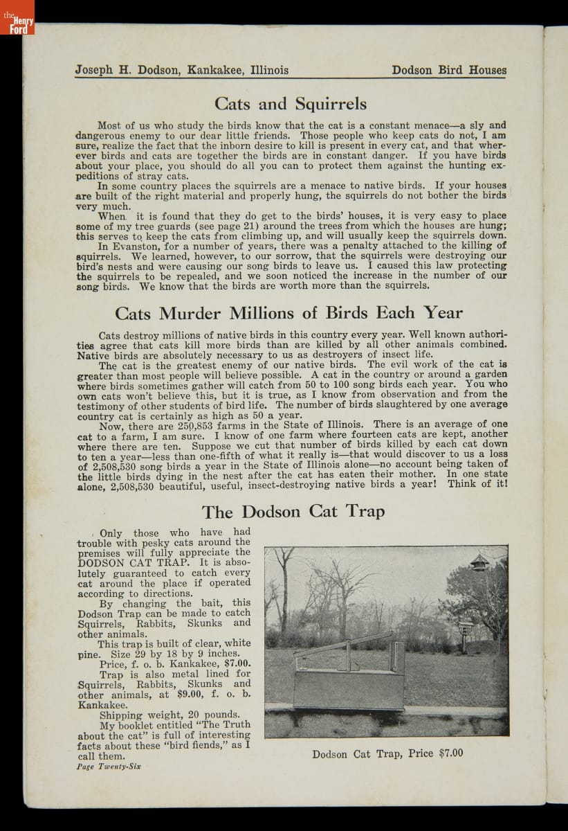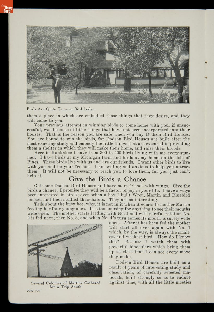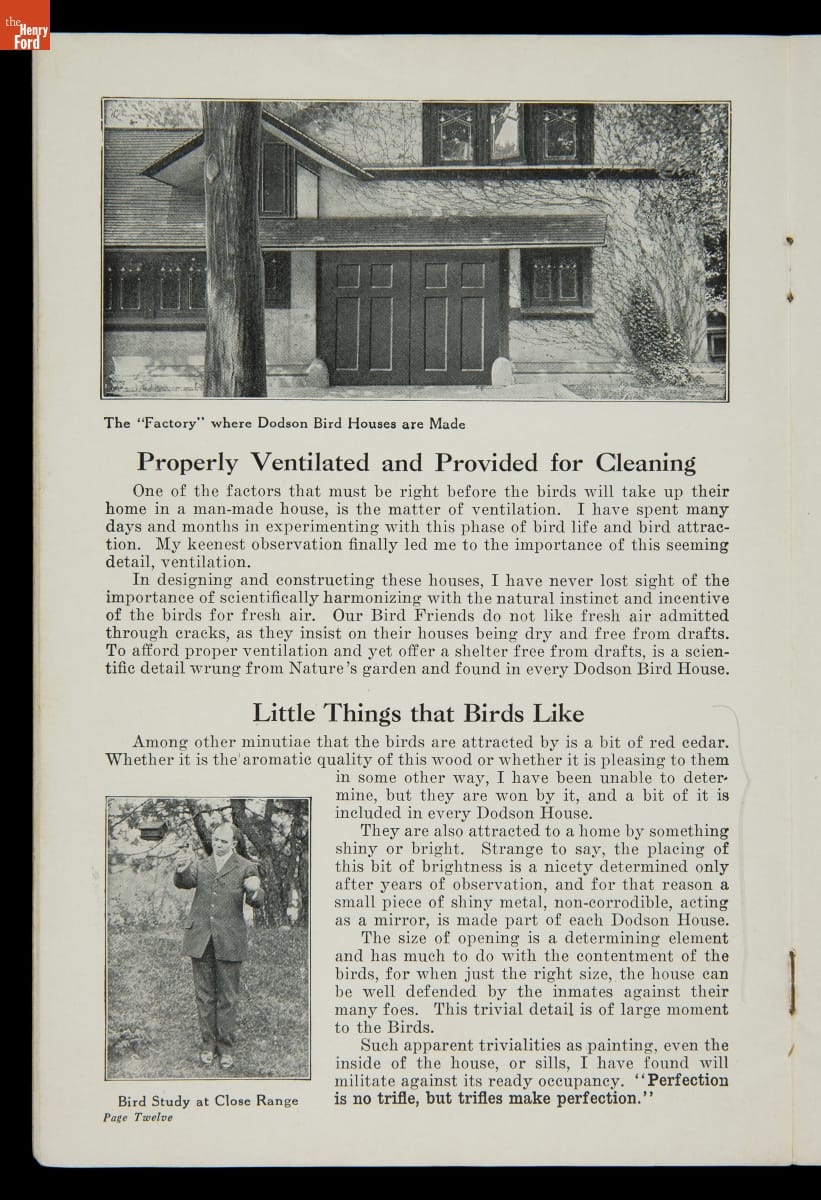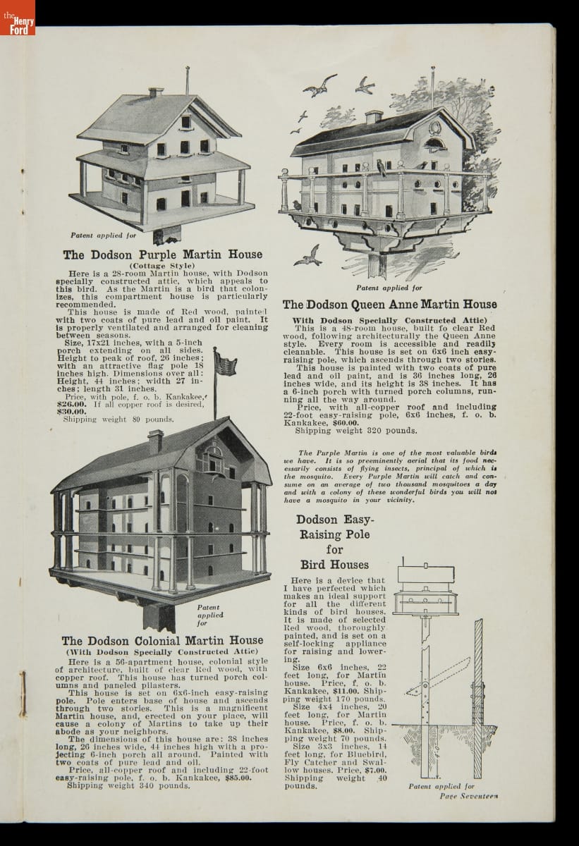 Joseph Dodson used his observations of songbird behavior to design products for his company, Dodson Bird Houses. In the company's catalog, Your Bird Friends and How to Win Them (1928), customers could choose from dozens of unique houses, feeders, and baths designed for different species' needs. It also featured essays on how to attract and care for wild birds.