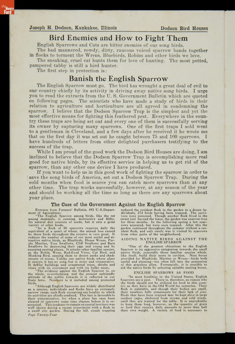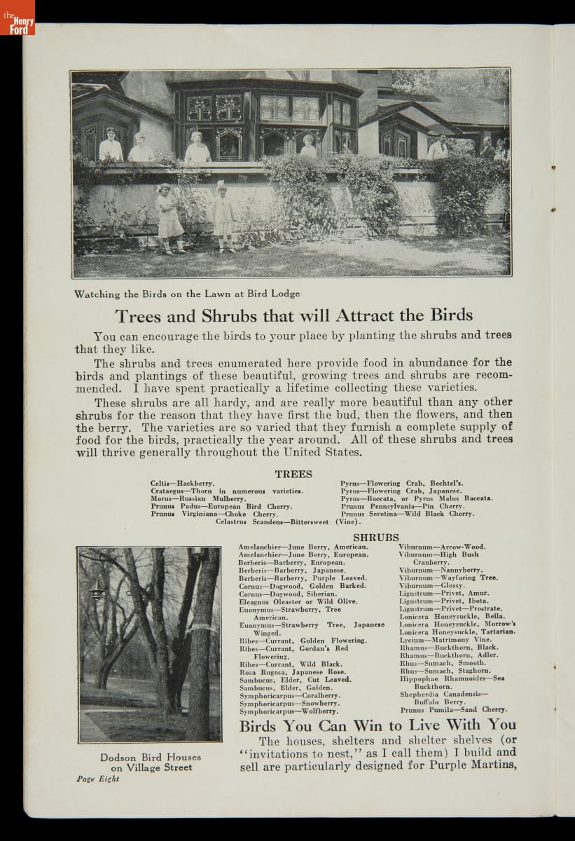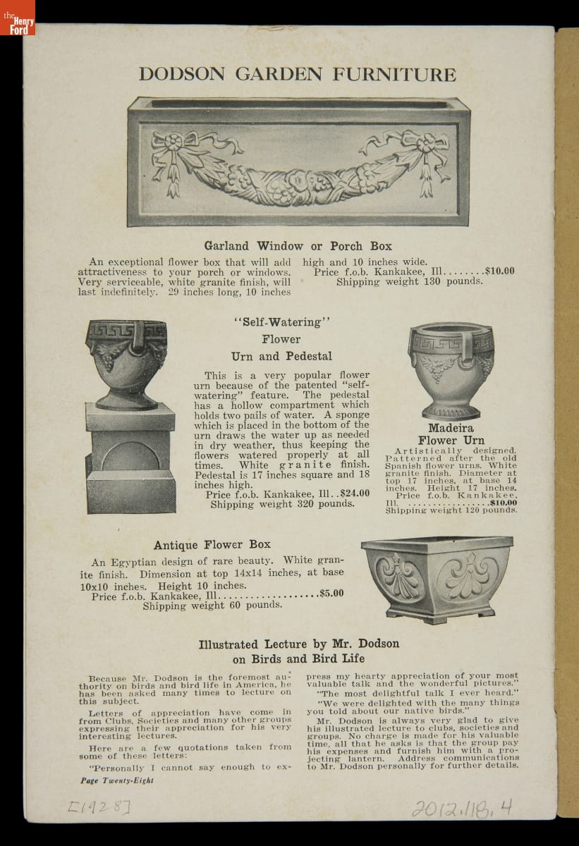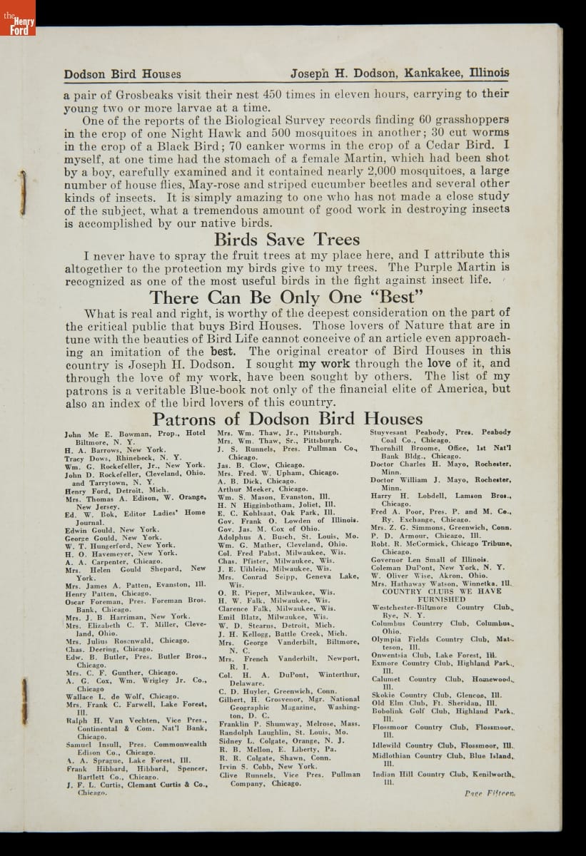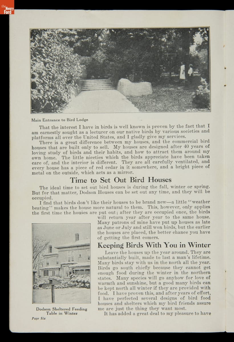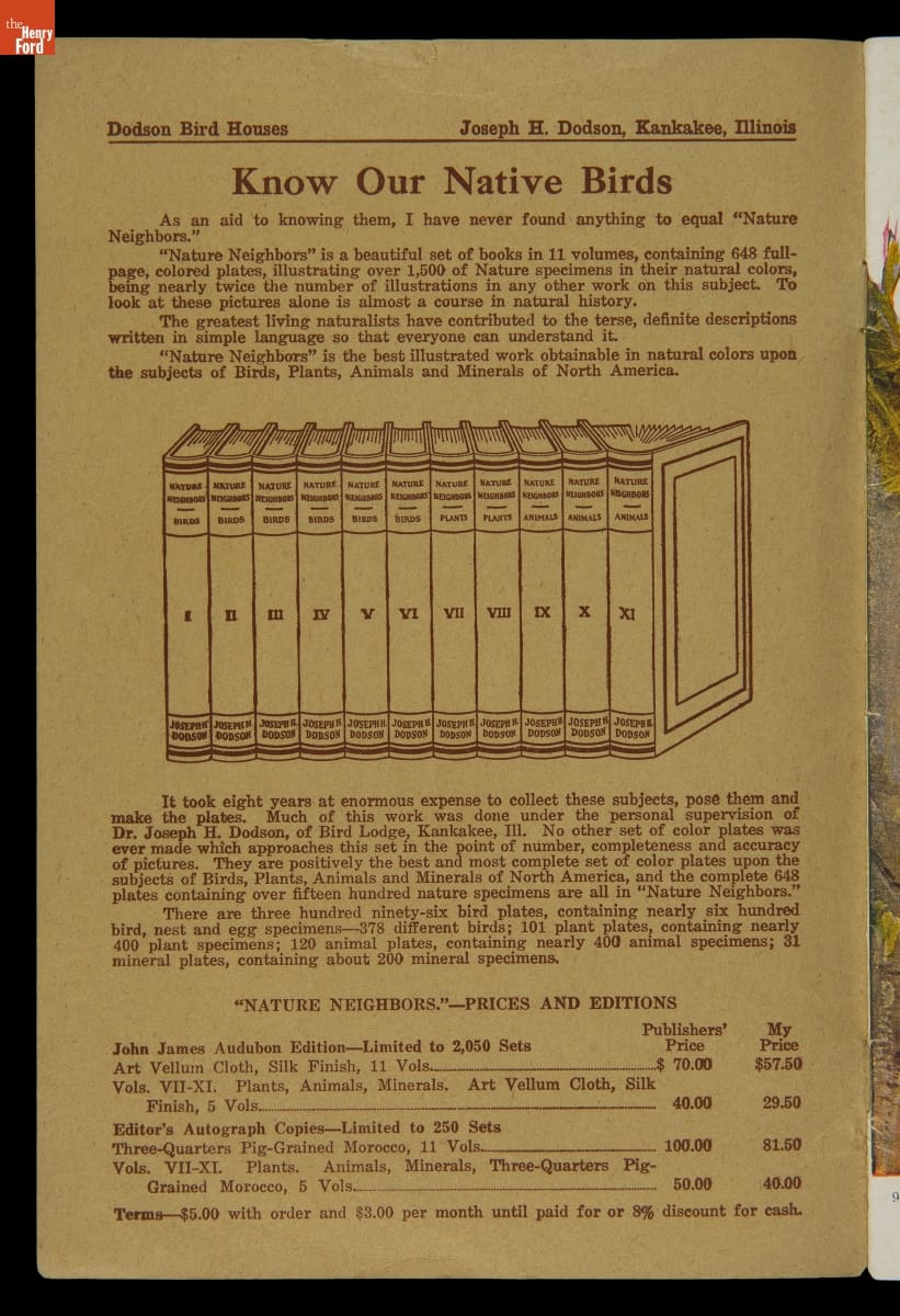 Joseph Dodson used his observations of songbird behavior to design products for his company, Dodson Bird Houses. In the company's catalog, Your Bird Friends and How to Win Them (1928), customers could choose from dozens of unique houses, feeders, and baths designed for different species' needs. It also featured essays on how to attract and care for wild birds.