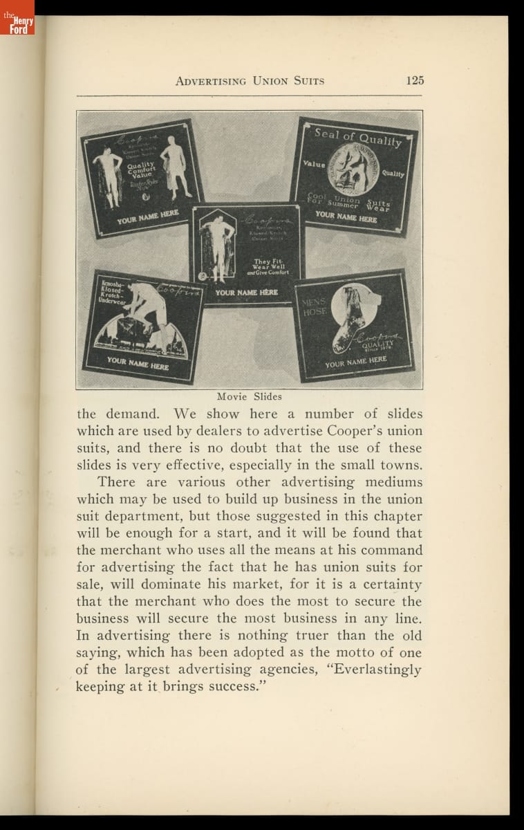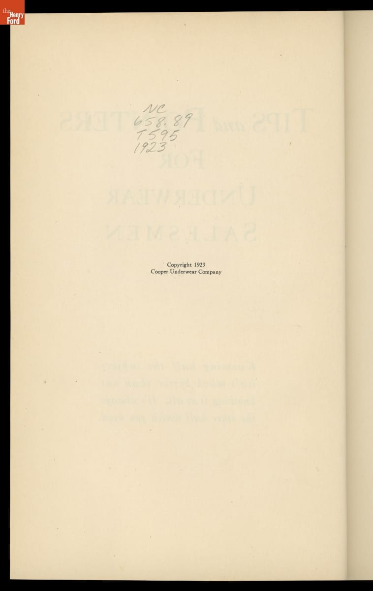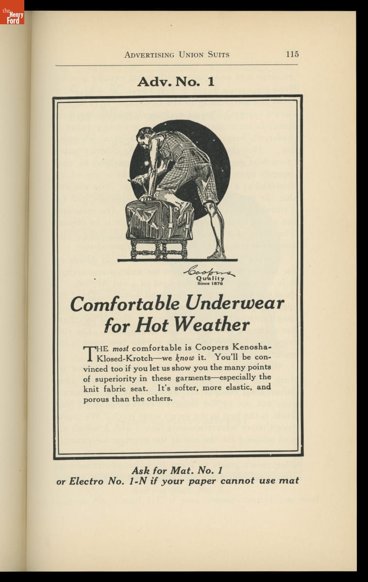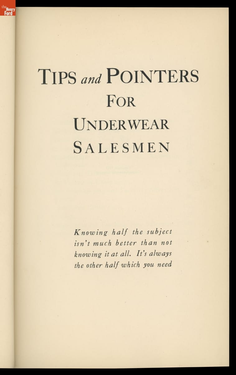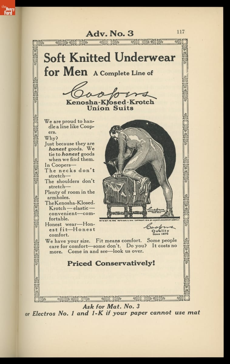 The Cooper Underwear Company, later renamed Jockey, produced this book to promote sales of its patented Kenosha Klosed Krotch union suit. It included advertising suggestions and information about materials, manufacturing, styles, and fit. The cover image, known as the "man on the bag," was created by popular commercial illustrator J.C. Leyendecker. It became central to the company's brand identity.