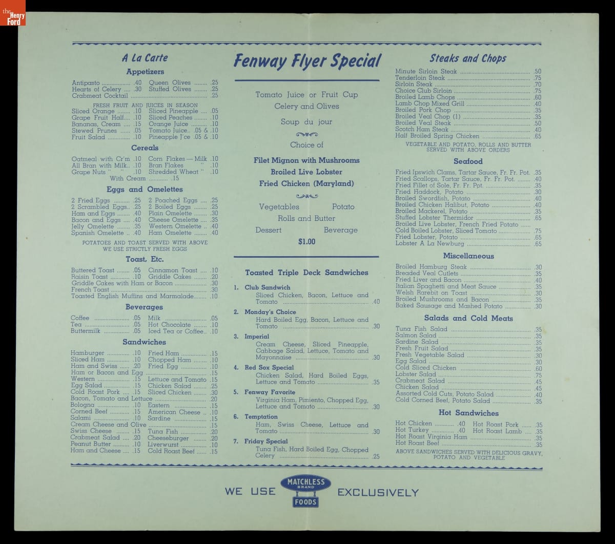 Menu from the Fenway Flyer Diner, Boston, Massachusetts