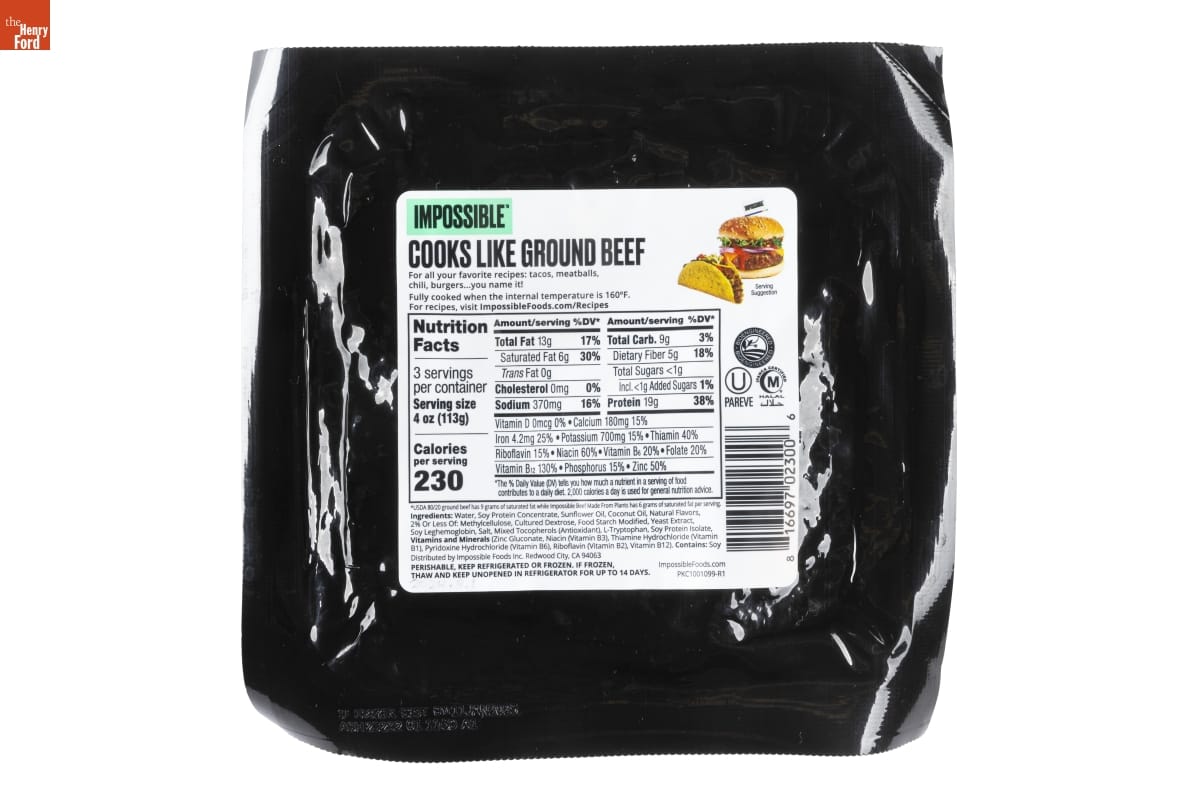 IMPOSSIBLE[TM] / COOKS LIKE GROUND BEEF / For all your favorite recipes: tacos, meatballs, / chili, burgers...you name it! / Fully cooked when the internal temperature is 160 F. / For recipes, visit ImpossibleFoods.com/Recipes / [...]