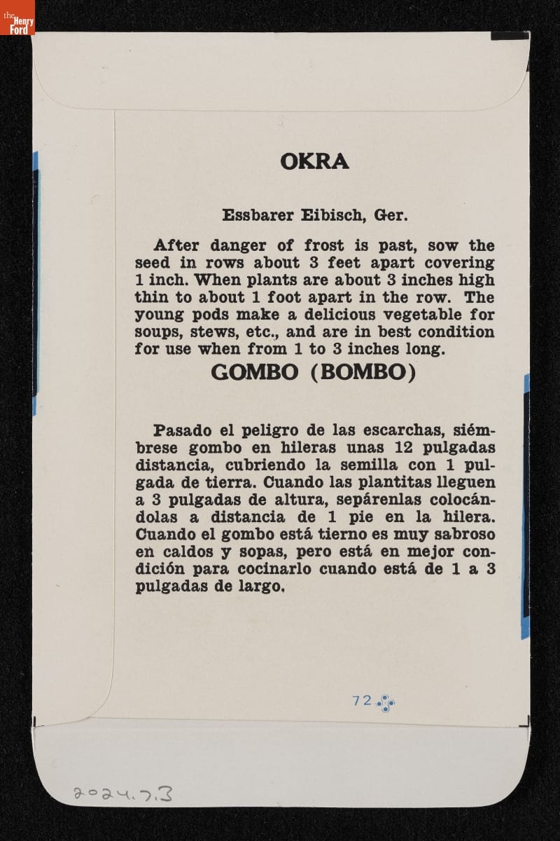OKRA / Essbarer Eibisch, Ger. / After danger of frost is past, sow the / seed in rows about 3 feet apart covering / 1 inch. When plants are about 3 inches high / then to about 3 inches high / thin to about 1 foot apart in the row. The / young pods make a delcious vegetable for / soups, stews, etc., and are in best condition / for use when from 1 to 3 inches long. / GOMBO (BOMBO) / [...] / 72