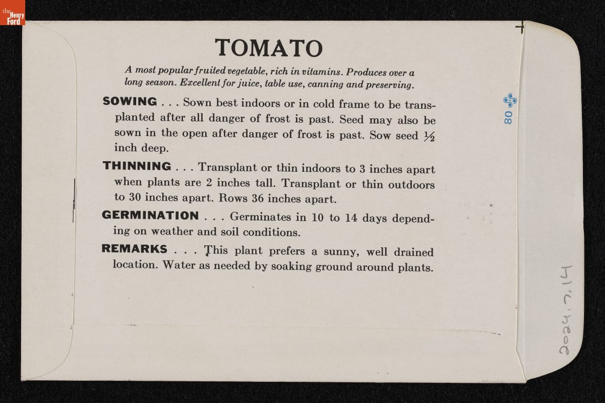 TOMATO / A most popular fruited vegetable, rich in vitamins. Produces over a / long season. Excellent for juice, table use, canning and preserving. / SOWING...Sown best indoors or in cold frame to be trans- / planted after all danger of frost is past. Seed may also be / sown in the open after danger of frost is past. Sow seen 1/2 / inch deep. / THINNING...Transplant or thin indoors to 3 inches apart / when plants are 2 inches tall. Transplant or think outdoors / to 30 inches apart. Rows 36 inches apart. / GERMINATION...Germinates in 10 to 14 days depen- / ing on weather and soil conditions. / REMARKS...The plant prefers a sunny, well drained / location Water as needed by soaking ground around plants.