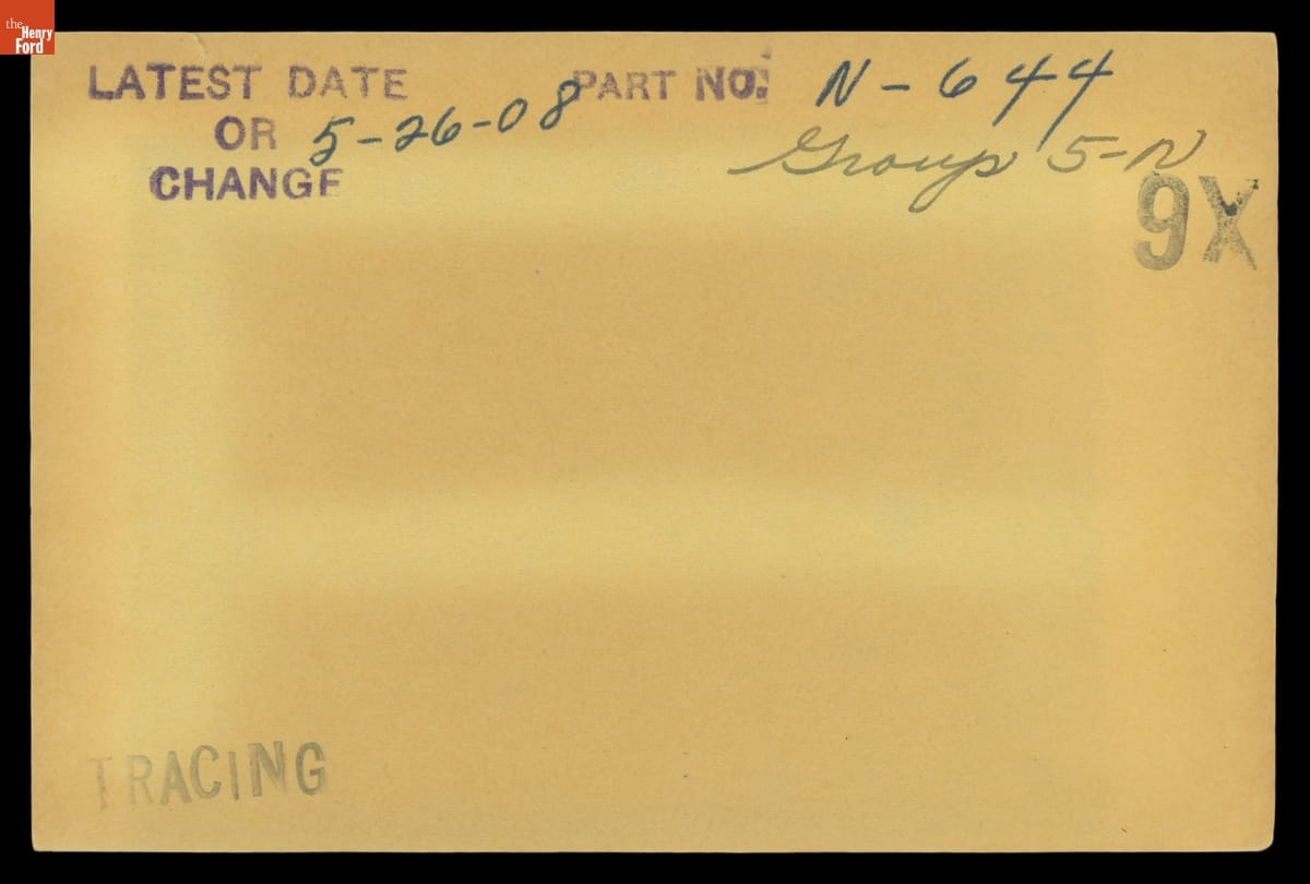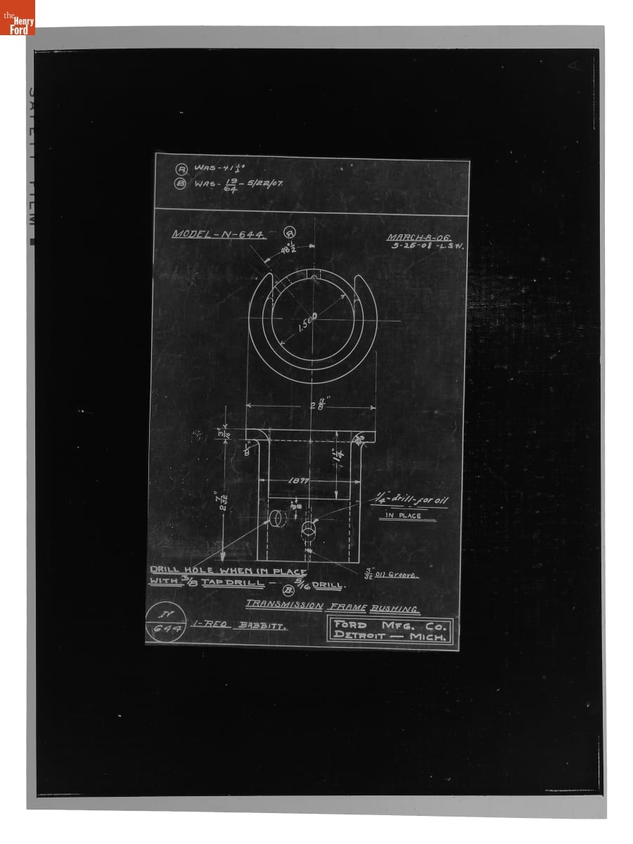 The Ford Motor Company created over a million parts drawings from 1903 to 1957. Many of these drawings specify engineering requirements for the components of Ford-made vehicles--including automobiles, trucks, tractors, military vehicles and Tri-motor airplanes. Others document assembly components, stages of casting and forging, or experimental designs. Beginning in the 1940s, Ford transferred the drawings to microfilm.