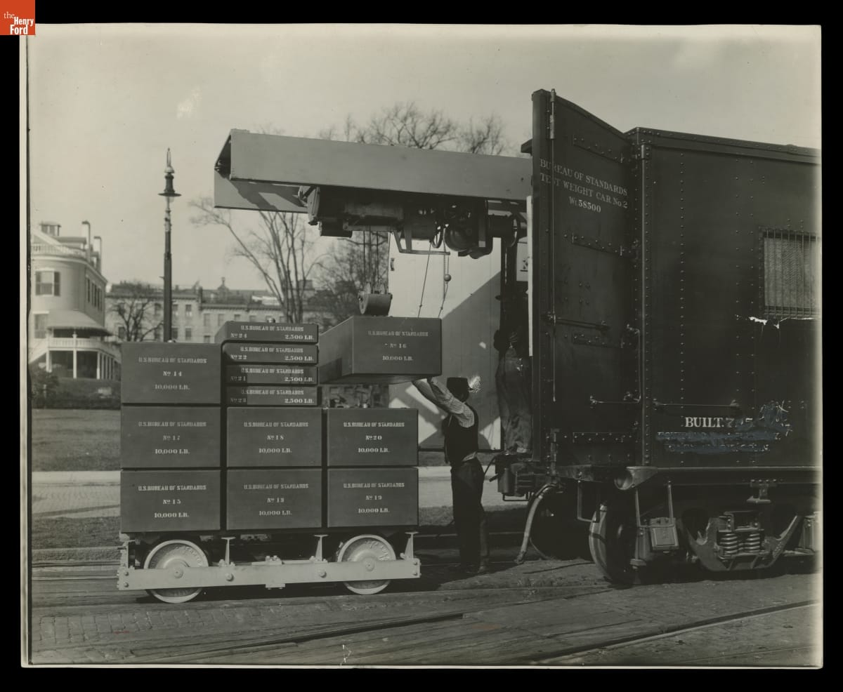 Railroads relied on accurate scales. The weight of a loaded freight car was used to calculate shipping charges. Weight measurements also helped prevent overloading, which could damage the car or track, bridges, and other structures. The large weights in this photo were used by the U.S. Bureau of Standards to verify the accuracy of railroad scales.