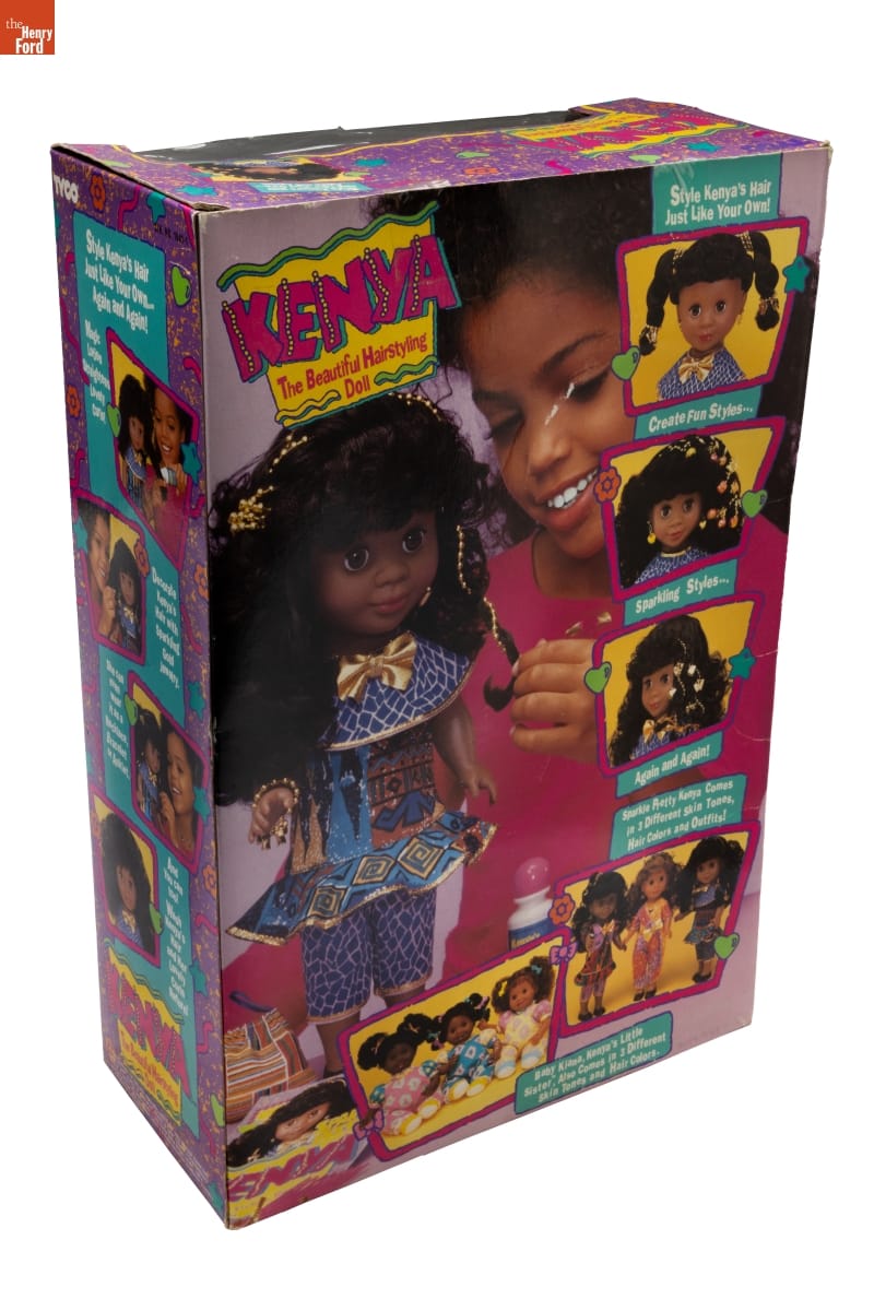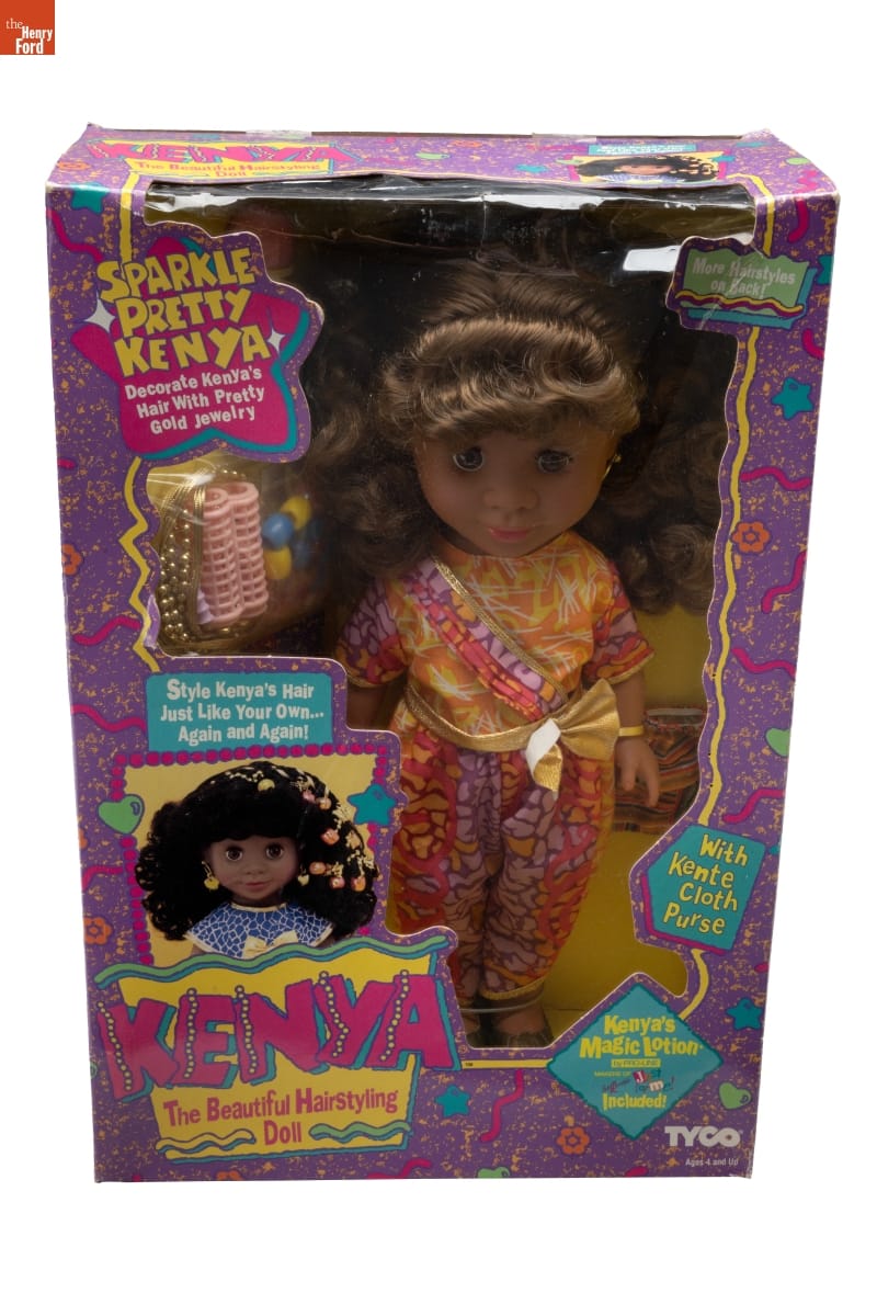 SPARKLE / PRETTY / KENYA / Decorate Kenya's / Hair With Pretty / Gold Jewelry / More Hairstyles / on Back! / Style Kenya's Hair / Just Like Your Own... / Again and Again! / KENYA / The Beautiful Hairstyling / Doll / With / Kente / Cloth / Purse / Kenya's / Magic Lotion / by PRO-LINE / MAKERS OF / Soft & Beautiful / Just for Me / Included! / TYCO / Ages 4 and Up